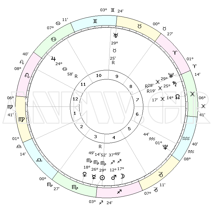 | | ΘΕΣΕΙΣ ΠΛΑΝΗΤΩΝ ΑΣΤΡΟΛΟΓΙΚΟΥ ΧΑΡΤΗ ΤΗΣ ΣΤΙΓΜΗΣ ΑΥΤΗΣ | | | | Πλανήτης | Ζώδιο | Μοίρες | Δεκαήμ. | Σε οίκο | Απόκλιση | | Ακμές των οίκων | | Ηλιος | Σκορπιός | 29°49' | Τρίτο | 4 | 20 S 06 | | 1ος | 20°32' | Λέων | | Σελήνη | Τοξότης | 17°09' | Δεύτερο | 4 | 27 S 47 | | 2ος | 13°23' | Παρθένος | | Ερμής | Σκορπιός | 26°19'R | Τρίτο | 4 | 18 S 19 | | 3ος | 11°06' | Ζυγός | | Αφροδίτη | Σκορπιός | 18°45' | Δεύτερο | 4 | 16 S 25 | | 4ος | 13°47' | Σκορπιός | | Αρης | Τοξότης | 12°35' | Δεύτερο | 4 | 22 S 53 | | 5ος | 18°39' | Τοξότης | | Δίας | Καρκίνος | 24°59'R | Τρίτο | 12 | 21 N 16 | | 6ος | 21°30' | Αιγόκερως | | Κρόνος | Ιχθείς | 25°19'R | Τρίτο | 8 | 04 S 04 | | 7ος | 20°32' | Υδροχόος | | Ουρανός | Ταύρος | 29°25'R | Τρίτο | 10 | 19 N 49 | | 8ος | 13°23' | Ιχθείς | | Ποσειδώνας | Ιχθείς | 29°28'R | Τρίτο | 8 | 01 S 27 | | 9ος | 11°06' | Κριός | | Πλούτωνας | Υδροχόος | 01°43' | Πρώτο | 6 | 23 S 27 | | 10ος | 13°47' | Ταύρος | | Β. Δεσμός | Ιχθείς | 14°18' | Δεύτερο | 8 | 06 S 11 | | 11ος | 18°39' | Δίδυμοι | | Ωροσκόπος | Λέων | 20°32' | Τρίτο | | | 12ος | 21°30' | Καρκίνος | | Μεσουράνημα | Ταύρος | 13°47' | Δεύτερο | | | |