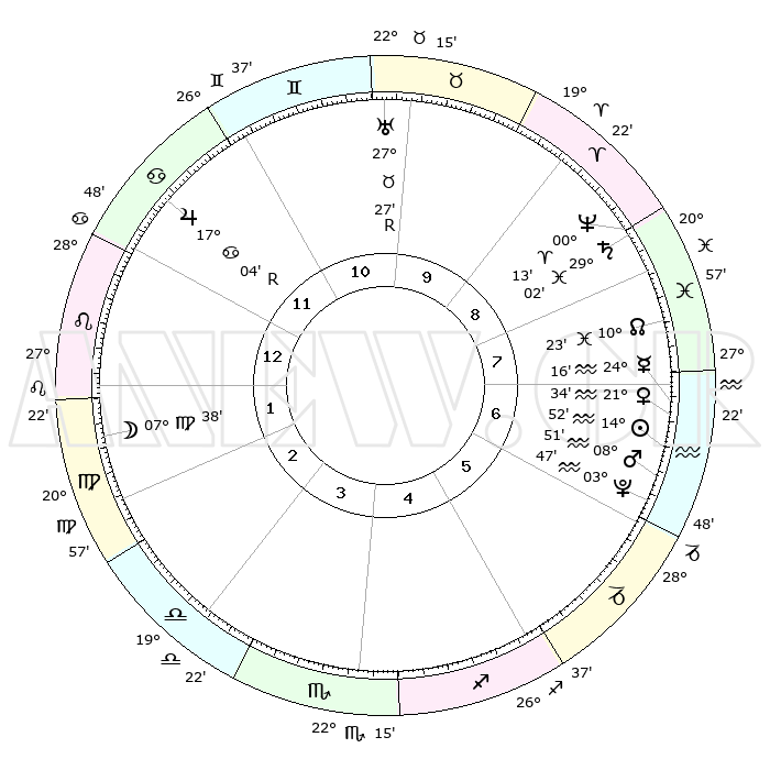 | | ΘΕΣΕΙΣ ΠΛΑΝΗΤΩΝ ΑΣΤΡΟΛΟΓΙΚΟΥ ΧΑΡΤΗ ΤΗΣ ΣΤΙΓΜΗΣ ΑΥΤΗΣ | | | | Πλανήτης | Ζώδιο | Μοίρες | Δεκαήμ. | Σε οίκο | Απόκλιση | | Ακμές των οίκων | | Ηλιος | Υδροχόος | 14°48' | Δεύτερο | 7 | 16 S 24 | | 1ος | 05°14' | Λέων | | Σελήνη | Παρθένος | 06°36' | Πρώτο | 2 | 09 N 18 | | 2ος | 26°39' | Λέων | | Ερμής | Υδροχόος | 24°08' | Τρίτο | 7 | 15 S 04 | | 3ος | 22°25' | Παρθένος | | Αφροδίτη | Υδροχόος | 21°29' | Τρίτο | 7 | 15 S 40 | | 4ος | 24°03' | Ζυγός | | Αρης | Υδροχόος | 08°48' | Πρώτο | 7 | 19 S 04 | | 5ος | 29°55' | Σκορπιός | | Δίας | Καρκίνος | 17°04'R | Δεύτερο | 12 | 22 N 39 | | 6ος | 04°46' | Αιγόκερως | | Κρόνος | Ιχθείς | 29°01' | Τρίτο | 9 | 02 S 23 | | 7ος | 05°14' | Υδροχόος | | Ουρανός | Ταύρος | 27°27'R | Τρίτο | 10 | 19 N 24 | | 8ος | 26°39' | Υδροχόος | | Ποσειδώνας | Κριός | 00°13' | Πρώτο | 9 | 01 S 07 | | 9ος | 22°25' | Ιχθείς | | Πλούτωνας | Υδροχόος | 03°47' | Πρώτο | 6 | 23 S 00 | | 10ος | 24°03' | Κριός | | Β. Δεσμός | Ιχθείς | 10°23' | Δεύτερο | 8 | 07 S 40 | | 11ος | 29°55' | Ταύρος | | Ωροσκόπος | Λέων | 05°14' | Πρώτο | | | 12ος | 04°46' | Καρκίνος | | Μεσουράνημα | Κριός | 24°03' | Τρίτο | | | |