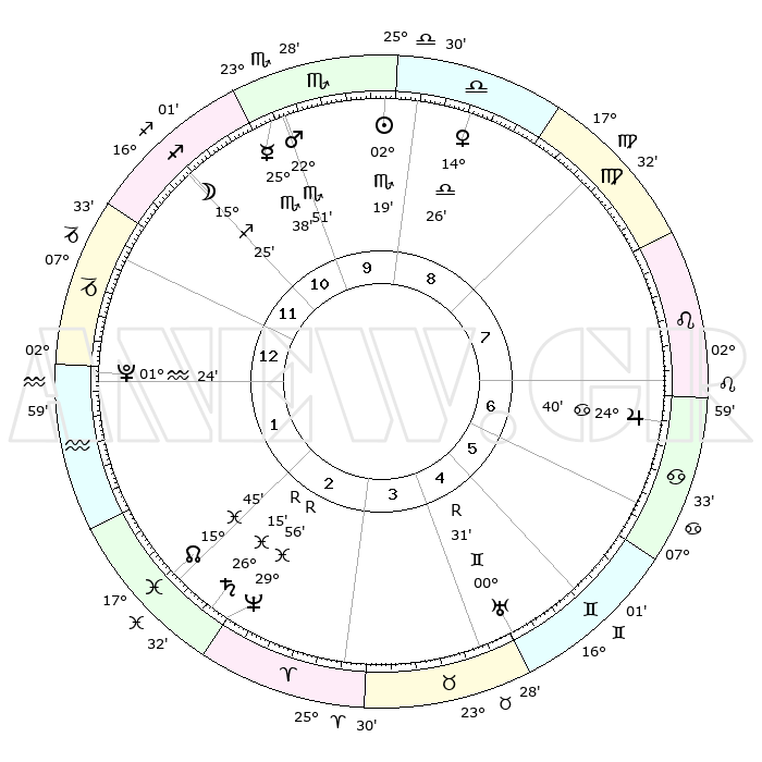 | | ΘΕΣΕΙΣ ΠΛΑΝΗΤΩΝ ΑΣΤΡΟΛΟΓΙΚΟΥ ΧΑΡΤΗ ΤΗΣ ΣΤΙΓΜΗΣ ΑΥΤΗΣ | | | | Πλανήτης | Ζώδιο | Μοίρες | Δεκαήμ. | Σε οίκο | Απόκλιση | | Ακμές των οίκων | | Ηλιος | Σκορπιός | 01°51' | Πρώτο | 2 | 12 S 07 | | 1ος | 10°44' | Παρθένος | | Σελήνη | Τοξότης | 10°00' | Δεύτερο | 4 | 26 S 59 | | 2ος | 05°41' | Ζυγός | | Ερμής | Σκορπιός | 25°06' | Τρίτο | 3 | 21 S 35 | | 3ος | 05°11' | Σκορπιός | | Αφροδίτη | Ζυγός | 13°52' | Δεύτερο | 2 | 04 S 04 | | 4ος | 08°08' | Τοξότης | | Αρης | Σκορπιός | 22°32' | Τρίτο | 3 | 18 S 43 | | 5ος | 11°41' | Αιγόκερως | | Δίας | Καρκίνος | 24°39' | Τρίτο | 11 | 21 N 15 | | 6ος | 12°56' | Υδροχόος | | Κρόνος | Ιχθείς | 26°17'R | Τρίτο | 7 | 03 S 46 | | 7ος | 10°44' | Ιχθείς | | Ουρανός | Δίδυμοι | 00°32'R | Πρώτο | 9 | 20 N 03 | | 8ος | 05°41' | Κριός | | Ποσειδώνας | Ιχθείς | 29°56'R | Τρίτο | 7 | 01 S 17 | | 9ος | 05°11' | Ταύρος | | Πλούτωνας | Υδροχόος | 01°24' | Πρώτο | 5 | 23 S 32 | | 10ος | 08°08' | Δίδυμοι | | Β. Δεσμός | Ιχθείς | 15°46' | Δεύτερο | 7 | 05 S 37 | | 11ος | 11°41' | Καρκίνος | | Ωροσκόπος | Παρθένος | 10°44' | Δεύτερο | | | 12ος | 12°56' | Λέων | | Μεσουράνημα | Δίδυμοι | 08°08' | Πρώτο | | | |