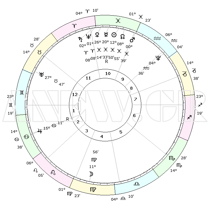 | | ΘΕΣΕΙΣ ΠΛΑΝΗΤΩΝ ΑΣΤΡΟΛΟΓΙΚΟΥ ΧΑΡΤΗ ΤΗΣ ΣΤΙΓΜΗΣ ΑΥΤΗΣ | | | | Πλανήτης | Ζώδιο | Μοίρες | Δεκαήμ. | Σε οίκο | Απόκλιση | | Ακμές των οίκων | | Ηλιος | Ιχθείς | 12°46' | Δεύτερο | 11 | 06 S 46 | | 1ος | 29°19' | Ταύρος | | Σελήνη | Παρθένος | 11°06' | Δεύτερο | 5 | 07 N 13 | | 2ος | 24°16' | Δίδυμοι | | Ερμής | Ιχθείς | 20°35'R | Τρίτο | 11 | 00 S 26 | | 3ος | 15°42' | Καρκίνος | | Αφροδίτη | Ιχθείς | 26°09' | Τρίτο | 11 | 02 S 44 | | 4ος | 08°25' | Λέων | | Αρης | Ιχθείς | 00°36' | Πρώτο | 10 | 12 S 17 | | 5ος | 06°46' | Παρθένος | | Δίας | Καρκίνος | 15°11'R | Δεύτερο | 2 | 22 N 55 | | 6ος | 15°06' | Ζυγός | | Κρόνος | Κριός | 02°07' | Πρώτο | 11 | 01 S 07 | | 7ος | 29°19' | Σκορπιός | | Ουρανός | Ταύρος | 27°47' | Τρίτο | 12 | 19 N 29 | | 8ος | 24°16' | Τοξότης | | Ποσειδώνας | Κριός | 01°08' | Πρώτο | 11 | 00 S 45 | | 9ος | 15°42' | Αιγόκερως | | Πλούτωνας | Υδροχόος | 04°36' | Πρώτο | 9 | 22 S 52 | | 10ος | 08°25' | Υδροχόος | | Β. Δεσμός | Ιχθείς | 08°55' | Πρώτο | 11 | 08 S 13 | | 11ος | 06°46' | Ιχθείς | | Ωροσκόπος | Ταύρος | 29°19' | Τρίτο | | | 12ος | 15°06' | Κριός | | Μεσουράνημα | Υδροχόος | 08°25' | Πρώτο | | | |