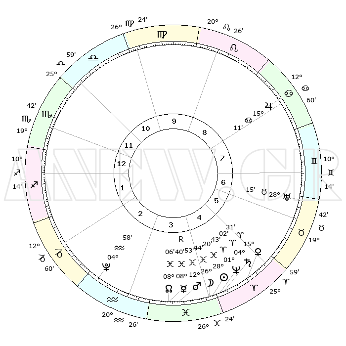 | | ΘΕΣΕΙΣ ΠΛΑΝΗΤΩΝ ΑΣΤΡΟΛΟΓΙΚΟΥ ΧΑΡΤΗ ΤΗΣ ΣΤΙΓΜΗΣ ΑΥΤΗΣ | | | | Πλανήτης | Ζώδιο | Μοίρες | Δεκαήμ. | Σε οίκο | Απόκλιση | | Ακμές των οίκων | | Ηλιος | Ιχθείς | 28°16' | Τρίτο | 4 | 00 S 41 | | 1ος | 19°40' | Σκορπιός | | Σελήνη | Ιχθείς | 25°46' | Τρίτο | 4 | 00 S 17 | | 2ος | 19°34' | Τοξότης | | Ερμής | Ιχθείς | 08°41'R | Πρώτο | 4 | 06 S 57 | | 3ος | 23°41' | Αιγόκερως | | Αφροδίτη | Κριός | 15°26' | Δεύτερο | 5 | 05 N 13 | | 4ος | 29°16' | Υδροχόος | | Αρης | Ιχθείς | 12°49' | Δεύτερο | 4 | 07 S 45 | | 5ος | 01°21' | Κριός | | Δίας | Καρκίνος | 15°11' | Δεύτερο | 8 | 22 N 56 | | 6ος | 27°48' | Κριός | | Κρόνος | Κριός | 04°01' | Πρώτο | 5 | 00 S 21 | | 7ος | 19°40' | Ταύρος | | Ουρανός | Ταύρος | 28°15' | Τρίτο | 7 | 19 N 36 | | 8ος | 19°34' | Δίδυμοι | | Ποσειδώνας | Κριός | 01°43' | Πρώτο | 5 | 00 S 31 | | 9ος | 23°41' | Καρκίνος | | Πλούτωνας | Υδροχόος | 04°58' | Πρώτο | 3 | 22 S 49 | | 10ος | 29°16' | Λέων | | Β. Δεσμός | Ιχθείς | 08°06' | Πρώτο | 4 | 08 S 32 | | 11ος | 01°21' | Ζυγός | | Ωροσκόπος | Σκορπιός | 19°40' | Δεύτερο | | | 12ος | 27°48' | Ζυγός | | Μεσουράνημα | Λέων | 29°16' | Τρίτο | | | |