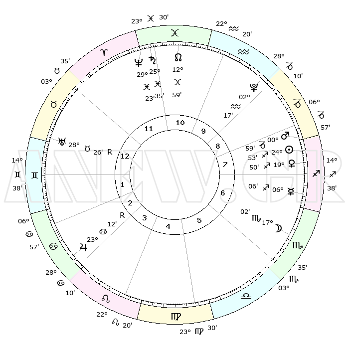| | ΘΕΣΕΙΣ ΠΛΑΝΗΤΩΝ ΑΣΤΡΟΛΟΓΙΚΟΥ ΧΑΡΤΗ ΤΗΣ ΣΤΙΓΜΗΣ ΑΥΤΗΣ | | | | Πλανήτης | Ζώδιο | Μοίρες | Δεκαήμ. | Σε οίκο | Απόκλιση | | Ακμές των οίκων | | Ηλιος | Τοξότης | 24°49' | Τρίτο | 8 | 23 S 20 | | 1ος | 13°28' | Ταύρος | | Σελήνη | Σκορπιός | 16°10' | Δεύτερο | 7 | 20 S 57 | | 2ος | 12°05' | Δίδυμοι | | Ερμής | Τοξότης | 05°60' | Πρώτο | 7 | 19 S 59 | | 3ος | 04°27' | Καρκίνος | | Αφροδίτη | Τοξότης | 19°45' | Δεύτερο | 8 | 22 S 56 | | 4ος | 26°21' | Καρκίνος | | Αρης | Αιγόκερως | 00°55' | Πρώτο | 8 | 24 S 13 | | 5ος | 22°18' | Λέων | | Δίας | Καρκίνος | 23°12'R | Τρίτο | 3 | 21 N 38 | | 6ος | 27°43' | Παρθένος | | Κρόνος | Ιχθείς | 25°35' | Τρίτο | 11 | 03 S 53 | | 7ος | 13°28' | Σκορπιός | | Ουρανός | Ταύρος | 28°26'R | Τρίτο | 1 | 19 N 37 | | 8ος | 12°05' | Τοξότης | | Ποσειδώνας | Ιχθείς | 29°23' | Τρίτο | 12 | 01 S 29 | | 9ος | 04°27' | Αιγόκερως | | Πλούτωνας | Υδροχόος | 02°17' | Πρώτο | 10 | 23 S 19 | | 10ος | 26°21' | Αιγόκερως | | Β. Δεσμός | Ιχθείς | 12°59' | Δεύτερο | 11 | 06 S 41 | | 11ος | 22°18' | Υδροχόος | | Ωροσκόπος | Ταύρος | 13°28' | Δεύτερο | | | 12ος | 27°43' | Ιχθείς | | Μεσουράνημα | Αιγόκερως | 26°21' | Τρίτο | | | |