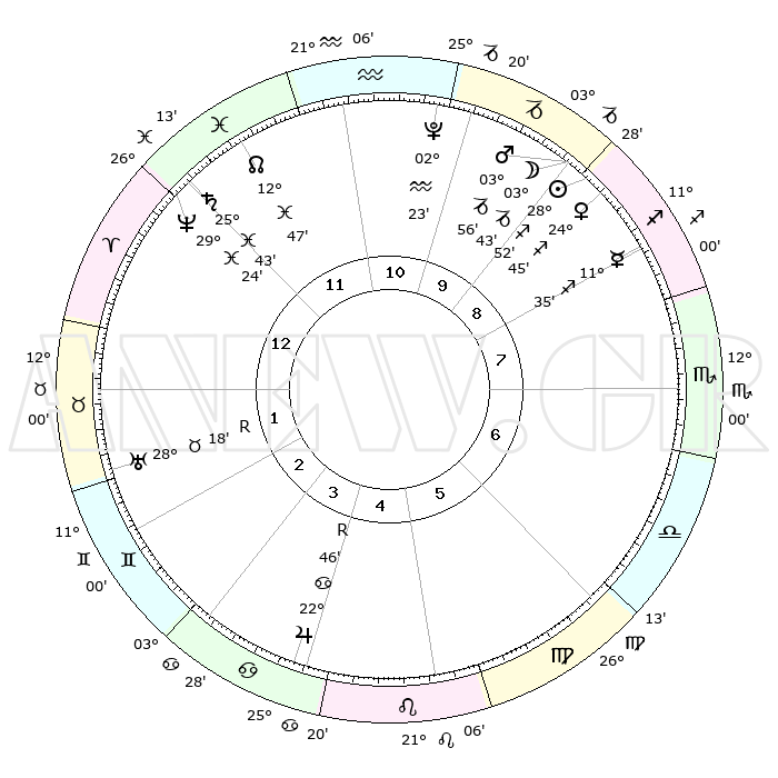 | | ΘΕΣΕΙΣ ΠΛΑΝΗΤΩΝ ΑΣΤΡΟΛΟΓΙΚΟΥ ΧΑΡΤΗ ΤΗΣ ΣΤΙΓΜΗΣ ΑΥΤΗΣ | | | | Πλανήτης | Ζώδιο | Μοίρες | Δεκαήμ. | Σε οίκο | Απόκλιση | | Ακμές των οίκων | | Ηλιος | Τοξότης | 28°44' | Τρίτο | 10 | 23 S 26 | | 1ος | 27°33' | Υδροχόος | | Σελήνη | Αιγόκερως | 02°07' | Πρώτο | 10 | 28 S 07 | | 2ος | 13°08' | Κριός | | Ερμής | Τοξότης | 11°24' | Δεύτερο | 10 | 21 S 18 | | 3ος | 16°20' | Ταύρος | | Αφροδίτη | Τοξότης | 24°36' | Τρίτο | 10 | 23 S 22 | | 4ος | 10°59' | Δίδυμοι | | Αρης | Αιγόκερως | 03°50' | Πρώτο | 11 | 24 S 11 | | 5ος | 02°41' | Καρκίνος | | Δίας | Καρκίνος | 22°47'R | Τρίτο | 5 | 21 N 43 | | 6ος | 26°00' | Καρκίνος | | Κρόνος | Ιχθείς | 25°43' | Τρίτο | 1 | 03 S 49 | | 7ος | 27°33' | Λέων | | Ουρανός | Ταύρος | 28°18'R | Τρίτο | 3 | 19 N 35 | | 8ος | 13°08' | Ζυγός | | Ποσειδώνας | Ιχθείς | 29°24' | Τρίτο | 1 | 01 S 28 | | 9ος | 16°20' | Σκορπιός | | Πλούτωνας | Υδροχόος | 02°23' | Πρώτο | 12 | 23 S 17 | | 10ος | 10°59' | Τοξότης | | Β. Δεσμός | Ιχθείς | 12°47' | Δεύτερο | 1 | 06 S 46 | | 11ος | 02°41' | Αιγόκερως | | Ωροσκόπος | Υδροχόος | 27°33' | Τρίτο | | | 12ος | 26°00' | Αιγόκερως | | Μεσουράνημα | Τοξότης | 10°59' | Δεύτερο | | | |