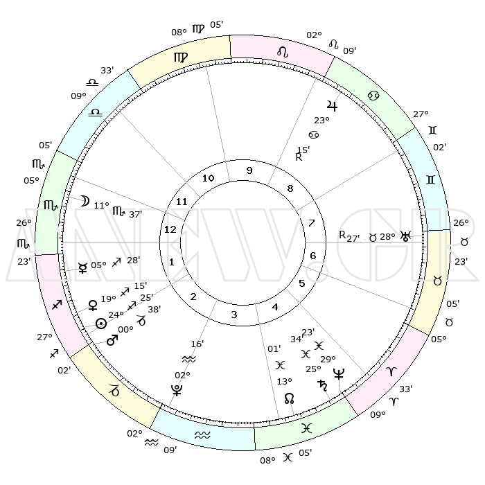 | | ΘΕΣΕΙΣ ΠΛΑΝΗΤΩΝ ΑΣΤΡΟΛΟΓΙΚΟΥ ΧΑΡΤΗ ΤΗΣ ΣΤΙΓΜΗΣ ΑΥΤΗΣ | | | | Πλανήτης | Ζώδιο | Μοίρες | Δεκαήμ. | Σε οίκο | Απόκλιση | | Ακμές των οίκων | | Ηλιος | Τοξότης | 23°45' | Τρίτο | 9 | 23 S 17 | | 1ος | 18°20' | Κριός | | Σελήνη | Σκορπιός | 03°48' | Πρώτο | 7 | 16 S 26 | | 2ος | 23°48' | Ταύρος | | Ερμής | Τοξότης | 04°35' | Πρώτο | 8 | 19 S 36 | | 3ος | 18°40' | Δίδυμοι | | Αφροδίτη | Τοξότης | 18°26' | Δεύτερο | 8 | 22 S 47 | | 4ος | 10°26' | Καρκίνος | | Αρης | Αιγόκερως | 00°08' | Πρώτο | 9 | 24 S 13 | | 5ος | 03°49' | Λέων | | Δίας | Καρκίνος | 23°19'R | Τρίτο | 4 | 21 N 37 | | 6ος | 04°18' | Παρθένος | | Κρόνος | Ιχθείς | 25°33' | Τρίτο | 12 | 03 S 54 | | 7ος | 18°20' | Ζυγός | | Ουρανός | Ταύρος | 28°29'R | Τρίτο | 2 | 19 N 37 | | 8ος | 23°48' | Σκορπιός | | Ποσειδώνας | Ιχθείς | 29°23' | Τρίτο | 12 | 01 S 29 | | 9ος | 18°40' | Τοξότης | | Πλούτωνας | Υδροχόος | 02°15' | Πρώτο | 10 | 23 S 19 | | 10ος | 10°26' | Αιγόκερως | | Β. Δεσμός | Ιχθείς | 13°03' | Δεύτερο | 12 | 06 S 40 | | 11ος | 03°49' | Υδροχόος | | Ωροσκόπος | Κριός | 18°20' | Δεύτερο | | | 12ος | 04°18' | Ιχθείς | | Μεσουράνημα | Αιγόκερως | 10°26' | Δεύτερο | | | |