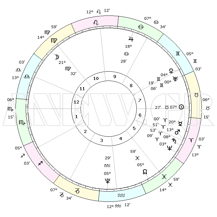 | | ΘΕΣΕΙΣ ΠΛΑΝΗΤΩΝ ΑΣΤΡΟΛΟΓΙΚΟΥ ΧΑΡΤΗ ΤΗΣ ΣΤΙΓΜΗΣ ΑΥΤΗΣ | | | | Πλανήτης | Ζώδιο | Μοίρες | Δεκαήμ. | Σε οίκο | Απόκλιση | | Ακμές των οίκων | | Ηλιος | Ταύρος | 07°24' | Πρώτο | 7 | 13 N 59 | | 1ος | 19°15' | Ζυγός | | Σελήνη | Παρθένος | 20°47' | Τρίτο | 11 | 02 N 34 | | 2ος | 17°02' | Σκορπιός | | Ερμής | Κριός | 19°54' | Δεύτερο | 7 | 05 N 42 | | 3ος | 18°17' | Τοξότης | | Αφροδίτη | Δίδυμοι | 04°14' | Πρώτο | 8 | 21 N 43 | | 4ος | 21°51' | Αιγόκερως | | Αρης | Κριός | 13°49' | Δεύτερο | 6 | 04 N 37 | | 5ος | 24°48' | Υδροχόος | | Δίας | Καρκίνος | 18°28' | Δεύτερο | 9 | 22 N 33 | | 6ος | 24°18' | Ιχθείς | | Κρόνος | Κριός | 08°53' | Πρώτο | 6 | 01 N 32 | | 7ος | 19°15' | Κριός | | Ουρανός | Δίδυμοι | 00°06' | Πρώτο | 8 | 20 N 00 | | 8ος | 17°02' | Ταύρος | | Ποσειδώνας | Κριός | 03°09' | Πρώτο | 6 | 00 N 03 | | 9ος | 18°17' | Δίδυμοι | | Πλούτωνας | Υδροχόος | 05°29' | Πρώτο | 4 | 22 S 48 | | 10ος | 21°51' | Καρκίνος | | Β. Δεσμός | Ιχθείς | 05°60' | Πρώτο | 5 | 09 S 19 | | 11ος | 24°48' | Λέων | | Ωροσκόπος | Ζυγός | 19°15' | Δεύτερο | | | 12ος | 24°18' | Παρθένος | | Μεσουράνημα | Καρκίνος | 21°51' | Τρίτο | | | |