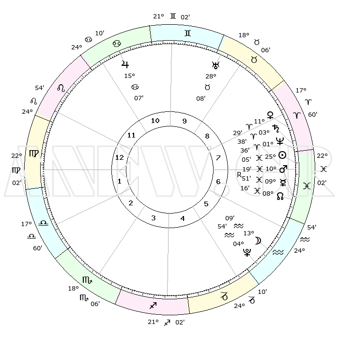 | | ΘΕΣΕΙΣ ΠΛΑΝΗΤΩΝ ΑΣΤΡΟΛΟΓΙΚΟΥ ΧΑΡΤΗ ΤΗΣ ΣΤΙΓΜΗΣ ΑΥΤΗΣ | | | | Πλανήτης | Ζώδιο | Μοίρες | Δεκαήμ. | Σε οίκο | Απόκλιση | | Ακμές των οίκων | | Ηλιος | Ιχθείς | 25°02' | Τρίτο | 7 | 01 S 58 | | 1ος | 04°06' | Παρθένος | | Σελήνη | Υδροχόος | 12°22' | Δεύτερο | 6 | 19 S 21 | | 2ος | 28°23' | Παρθένος | | Ερμής | Ιχθείς | 09°53'R | Πρώτο | 7 | 05 S 45 | | 3ος | 27°24' | Ζυγός | | Αφροδίτη | Κριός | 11°24' | Δεύτερο | 8 | 03 N 34 | | 4ος | 00°21' | Τοξότης | | Αρης | Ιχθείς | 10°16' | Δεύτερο | 7 | 08 S 43 | | 5ος | 04°16' | Αιγόκερως | | Δίας | Καρκίνος | 15°07' | Δεύτερο | 11 | 22 N 56 | | 6ος | 05°56' | Υδροχόος | | Κρόνος | Κριός | 03°37' | Πρώτο | 8 | 00 S 31 | | 7ος | 04°06' | Ιχθείς | | Ουρανός | Ταύρος | 28°08' | Τρίτο | 9 | 19 N 34 | | 8ος | 28°23' | Ιχθείς | | Ποσειδώνας | Κριός | 01°35' | Πρώτο | 8 | 00 S 34 | | 9ος | 27°24' | Κριός | | Πλούτωνας | Υδροχόος | 04°54' | Πρώτο | 5 | 22 S 49 | | 10ος | 00°21' | Δίδυμοι | | Β. Δεσμός | Ιχθείς | 08°16' | Πρώτο | 7 | 08 S 28 | | 11ος | 04°16' | Καρκίνος | | Ωροσκόπος | Παρθένος | 04°06' | Πρώτο | | | 12ος | 05°55' | Λέων | | Μεσουράνημα | Δίδυμοι | 00°21' | Πρώτο | | | |