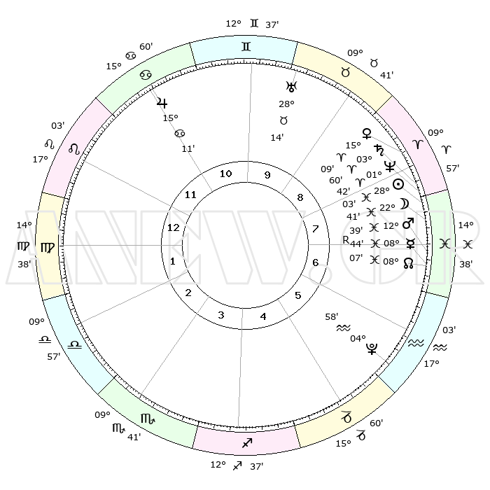 | | ΘΕΣΕΙΣ ΠΛΑΝΗΤΩΝ ΑΣΤΡΟΛΟΓΙΚΟΥ ΧΑΡΤΗ ΤΗΣ ΣΤΙΓΜΗΣ ΑΥΤΗΣ | | | | Πλανήτης | Ζώδιο | Μοίρες | Δεκαήμ. | Σε οίκο | Απόκλιση | | Ακμές των οίκων | | Ηλιος | Ιχθείς | 27°59' | Τρίτο | 8 | 00 S 48 | | 1ος | 24°22' | Λέων | | Σελήνη | Ιχθείς | 21°43' | Τρίτο | 8 | 02 S 13 | | 2ος | 17°37' | Παρθένος | | Ερμής | Ιχθείς | 08°45'R | Πρώτο | 7 | 06 S 52 | | 3ος | 15°44' | Ζυγός | | Αφροδίτη | Κριός | 15°04' | Δεύτερο | 8 | 05 N 04 | | 4ος | 18°33' | Σκορπιός | | Αρης | Ιχθείς | 12°36' | Δεύτερο | 7 | 07 S 50 | | 5ος | 23°09' | Τοξότης | | Δίας | Καρκίνος | 15°11' | Δεύτερο | 11 | 22 N 56 | | 6ος | 25°35' | Αιγόκερως | | Κρόνος | Κριός | 03°59' | Πρώτο | 8 | 00 S 22 | | 7ος | 24°22' | Υδροχόος | | Ουρανός | Ταύρος | 28°14' | Τρίτο | 10 | 19 N 35 | | 8ος | 17°37' | Ιχθείς | | Ποσειδώνας | Κριός | 01°42' | Πρώτο | 8 | 00 S 31 | | 9ος | 15°44' | Κριός | | Πλούτωνας | Υδροχόος | 04°58' | Πρώτο | 6 | 22 S 49 | | 10ος | 18°33' | Ταύρος | | Β. Δεσμός | Ιχθείς | 08°07' | Πρώτο | 7 | 08 S 32 | | 11ος | 23°09' | Δίδυμοι | | Ωροσκόπος | Λέων | 24°22' | Τρίτο | | | 12ος | 25°35' | Καρκίνος | | Μεσουράνημα | Ταύρος | 18°33' | Δεύτερο | | | |