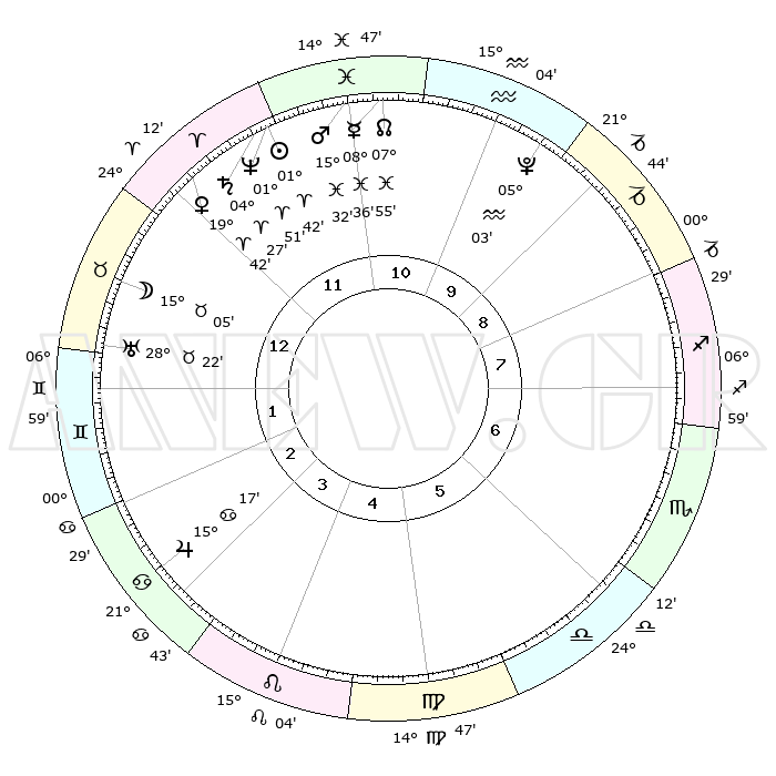 | | ΘΕΣΕΙΣ ΠΛΑΝΗΤΩΝ ΑΣΤΡΟΛΟΓΙΚΟΥ ΧΑΡΤΗ ΤΗΣ ΣΤΙΓΜΗΣ ΑΥΤΗΣ | | | | Πλανήτης | Ζώδιο | Μοίρες | Δεκαήμ. | Σε οίκο | Απόκλιση | | Ακμές των οίκων | | Ηλιος | Κριός | 01°38' | Πρώτο | 12 | 00 N 39 | | 1ος | 04°28' | Ταύρος | | Σελήνη | Ταύρος | 14°03' | Δεύτερο | 1 | 20 N 35 | | 2ος | 05°28' | Δίδυμοι | | Ερμής | Ιχθείς | 08°36' | Πρώτο | 11 | 07 S 45 | | 3ος | 28°35' | Δίδυμοι | | Αφροδίτη | Κριός | 19°37' | Δεύτερο | 12 | 06 N 55 | | 4ος | 20°18' | Καρκίνος | | Αρης | Ιχθείς | 15°29' | Δεύτερο | 11 | 06 S 43 | | 5ος | 15°10' | Λέων | | Δίας | Καρκίνος | 15°17' | Δεύτερο | 3 | 22 N 55 | | 6ος | 18°47' | Παρθένος | | Κρόνος | Κριός | 04°27' | Πρώτο | 12 | 00 S 11 | | 7ος | 04°28' | Σκορπιός | | Ουρανός | Ταύρος | 28°22' | Τρίτο | 1 | 19 N 37 | | 8ος | 05°28' | Τοξότης | | Ποσειδώνας | Κριός | 01°50' | Πρώτο | 12 | 00 S 28 | | 9ος | 28°35' | Τοξότης | | Πλούτωνας | Υδροχόος | 05°02' | Πρώτο | 10 | 22 S 48 | | 10ος | 20°18' | Αιγόκερως | | Β. Δεσμός | Ιχθείς | 07°55' | Πρώτο | 11 | 08 S 36 | | 11ος | 15°10' | Υδροχόος | | Ωροσκόπος | Ταύρος | 04°28' | Πρώτο | | | 12ος | 18°47' | Ιχθείς | | Μεσουράνημα | Αιγόκερως | 20°18' | Τρίτο | | | |