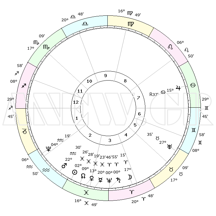 | | ΘΕΣΕΙΣ ΠΛΑΝΗΤΩΝ ΑΣΤΡΟΛΟΓΙΚΟΥ ΧΑΡΤΗ ΤΗΣ ΣΤΙΓΜΗΣ ΑΥΤΗΣ | | | | Πλανήτης | Ζώδιο | Μοίρες | Δεκαήμ. | Σε οίκο | Απόκλιση | | Ακμές των οίκων | | Ηλιος | Ιχθείς | 02°22' | Πρώτο | 3 | 10 S 38 | | 1ος | 07°17' | Τοξότης | | Σελήνη | Κριός | 16°15' | Δεύτερο | 4 | 09 N 21 | | 2ος | 09°32' | Αιγόκερως | | Ερμής | Ιχθείς | 20°19' | Τρίτο | 3 | 02 S 27 | | 3ος | 16°28' | Υδροχόος | | Αφροδίτη | Ιχθείς | 13°14' | Δεύτερο | 3 | 07 S 55 | | 4ος | 22°31' | Ιχθείς | | Αρης | Υδροχόος | 22°27' | Τρίτο | 3 | 15 S 03 | | 5ος | 22°33' | Κριός | | Δίας | Καρκίνος | 15°37'R | Δεύτερο | 8 | 22 N 51 | | 6ος | 16°38' | Ταύρος | | Κρόνος | Κριός | 00°54' | Πρώτο | 4 | 01 S 36 | | 7ος | 07°17' | Δίδυμοι | | Ουρανός | Ταύρος | 27°35' | Τρίτο | 6 | 19 N 26 | | 8ος | 09°32' | Καρκίνος | | Ποσειδώνας | Κριός | 00°46' | Πρώτο | 4 | 00 S 54 | | 9ος | 16°28' | Λέων | | Πλούτωνας | Υδροχόος | 04°19' | Πρώτο | 2 | 22 S 55 | | 10ος | 22°32' | Παρθένος | | Β. Δεσμός | Ιχθείς | 09°28' | Πρώτο | 3 | 08 S 01 | | 11ος | 22°33' | Ζυγός | | Ωροσκόπος | Τοξότης | 07°17' | Πρώτο | | | 12ος | 16°38' | Σκορπιός | | Μεσουράνημα | Παρθένος | 22°32' | Τρίτο | | | |
