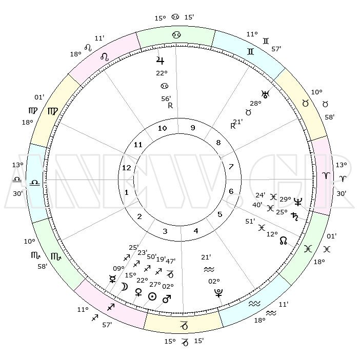 | | ΘΕΣΕΙΣ ΠΛΑΝΗΤΩΝ ΑΣΤΡΟΛΟΓΙΚΟΥ ΧΑΡΤΗ ΤΗΣ ΣΤΙΓΜΗΣ ΑΥΤΗΣ | | | | Πλανήτης | Ζώδιο | Μοίρες | Δεκαήμ. | Σε οίκο | Απόκλιση | | Ακμές των οίκων | | Ηλιος | Τοξότης | 26°54' | Τρίτο | 7 | 23 S 24 | | 1ος | 08°12' | Δίδυμοι | | Σελήνη | Τοξότης | 10°30' | Δεύτερο | 7 | 26 S 58 | | 2ος | 01°30' | Καρκίνος | | Ερμής | Τοξότης | 08°51' | Πρώτο | 7 | 20 S 42 | | 3ος | 22°43' | Καρκίνος | | Αφροδίτη | Τοξότης | 22°19' | Τρίτο | 7 | 23 S 11 | | 4ος | 16°11' | Λέων | | Αρης | Αιγόκερως | 02°28' | Πρώτο | 8 | 24 S 13 | | 5ος | 16°08' | Παρθένος | | Δίας | Καρκίνος | 22°59'R | Τρίτο | 3 | 21 N 41 | | 6ος | 25°40' | Ζυγός | | Κρόνος | Ιχθείς | 25°39' | Τρίτο | 11 | 03 S 51 | | 7ος | 08°12' | Τοξότης | | Ουρανός | Ταύρος | 28°22'R | Τρίτο | 12 | 19 N 36 | | 8ος | 01°30' | Αιγόκερως | | Ποσειδώνας | Ιχθείς | 29°24' | Τρίτο | 11 | 01 S 28 | | 9ος | 22°43' | Αιγόκερως | | Πλούτωνας | Υδροχόος | 02°20' | Πρώτο | 9 | 23 S 18 | | 10ος | 16°11' | Υδροχόος | | Β. Δεσμός | Ιχθείς | 12°53' | Δεύτερο | 10 | 06 S 43 | | 11ος | 16°08' | Ιχθείς | | Ωροσκόπος | Δίδυμοι | 08°12' | Πρώτο | | | 12ος | 25°40' | Κριός | | Μεσουράνημα | Υδροχόος | 16°11' | Δεύτερο | | | |