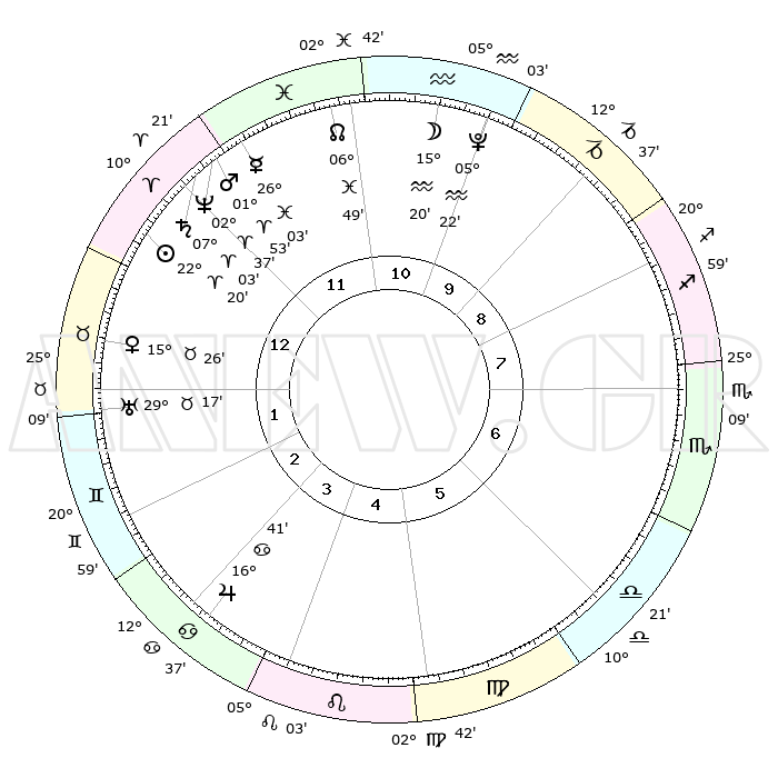 | | ΘΕΣΕΙΣ ΠΛΑΝΗΤΩΝ ΑΣΤΡΟΛΟΓΙΚΟΥ ΧΑΡΤΗ ΤΗΣ ΣΤΙΓΜΗΣ ΑΥΤΗΣ | | | | Πλανήτης | Ζώδιο | Μοίρες | Δεκαήμ. | Σε οίκο | Απόκλιση | | Ακμές των οίκων | | Ηλιος | Κριός | 22°16' | Τρίτο | 1 | 08 N 40 | | 1ος | 18°42' | Κριός | | Σελήνη | Υδροχόος | 14°26' | Δεύτερο | 11 | 18 S 29 | | 2ος | 24°04' | Ταύρος | | Ερμής | Ιχθείς | 25°57' | Τρίτο | 12 | 03 S 53 | | 3ος | 18°54' | Δίδυμοι | | Αφροδίτη | Ταύρος | 15°21' | Δεύτερο | 1 | 16 N 29 | | 4ος | 10°39' | Καρκίνος | | Αρης | Κριός | 01°50' | Πρώτο | 12 | 00 S 11 | | 5ος | 04°04' | Λέων | | Δίας | Καρκίνος | 16°41' | Δεύτερο | 4 | 22 N 46 | | 6ος | 04°37' | Παρθένος | | Κρόνος | Κριός | 07°02' | Πρώτο | 12 | 00 N 50 | | 7ος | 18°42' | Ζυγός | | Ουρανός | Ταύρος | 29°17' | Τρίτο | 2 | 19 N 50 | | 8ος | 24°04' | Σκορπιός | | Ποσειδώνας | Κριός | 02°37' | Πρώτο | 12 | 00 S 10 | | 9ος | 18°54' | Τοξότης | | Πλούτωνας | Υδροχόος | 05°22' | Πρώτο | 11 | 22 S 47 | | 10ος | 10°39' | Αιγόκερως | | Β. Δεσμός | Ιχθείς | 06°49' | Πρώτο | 12 | 09 S 00 | | 11ος | 04°04' | Υδροχόος | | Ωροσκόπος | Κριός | 18°42' | Δεύτερο | | | 12ος | 04°37' | Ιχθείς | | Μεσουράνημα | Αιγόκερως | 10°39' | Δεύτερο | | | |