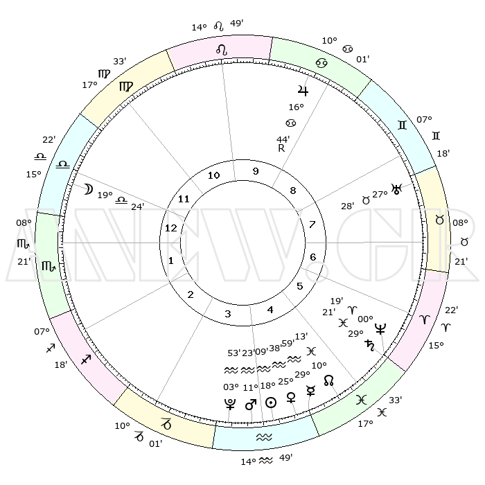 | | ΘΕΣΕΙΣ ΠΛΑΝΗΤΩΝ ΑΣΤΡΟΛΟΓΙΚΟΥ ΧΑΡΤΗ ΤΗΣ ΣΤΙΓΜΗΣ ΑΥΤΗΣ | | | | Πλανήτης | Ζώδιο | Μοίρες | Δεκαήμ. | Σε οίκο | Απόκλιση | | Ακμές των οίκων | | Ηλιος | Υδροχόος | 18°05' | Δεύτερο | 4 | 15 S 24 | | 1ος | 20°46' | Ζυγός | | Σελήνη | Ζυγός | 18°39' | Δεύτερο | 12 | 10 S 24 | | 2ος | 18°38' | Σκορπιός | | Ερμής | Υδροχόος | 29°53' | Τρίτο | 5 | 12 S 46 | | 3ος | 19°58' | Τοξότης | | Αφροδίτη | Υδροχόος | 25°33' | Τρίτο | 4 | 14 S 21 | | 4ος | 23°36' | Αιγόκερως | | Αρης | Υδροχόος | 11°21' | Δεύτερο | 4 | 18 S 23 | | 5ος | 26°33' | Υδροχόος | | Δίας | Καρκίνος | 16°44'R | Δεύτερο | 9 | 22 N 42 | | 6ος | 25°58' | Ιχθείς | | Κρόνος | Ιχθείς | 29°21' | Τρίτο | 6 | 02 S 15 | | 7ος | 20°46' | Κριός | | Ουρανός | Ταύρος | 27°28' | Τρίτο | 8 | 19 N 24 | | 8ος | 18°38' | Ταύρος | | Ποσειδώνας | Κριός | 00°19' | Πρώτο | 6 | 01 S 05 | | 9ος | 19°58' | Δίδυμοι | | Πλούτωνας | Υδροχόος | 03°53' | Πρώτο | 4 | 22 S 59 | | 10ος | 23°36' | Καρκίνος | | Β. Δεσμός | Ιχθείς | 10°13' | Δεύτερο | 5 | 07 S 44 | | 11ος | 26°33' | Λέων | | Ωροσκόπος | Ζυγός | 20°46' | Τρίτο | | | 12ος | 25°58' | Παρθένος | | Μεσουράνημα | Καρκίνος | 23°36' | Τρίτο | | | |