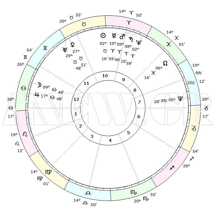 | | ΘΕΣΕΙΣ ΠΛΑΝΗΤΩΝ ΑΣΤΡΟΛΟΓΙΚΟΥ ΧΑΡΤΗ ΤΗΣ ΣΤΙΓΜΗΣ ΑΥΤΗΣ | | | | Πλανήτης | Ζώδιο | Μοίρες | Δεκαήμ. | Σε οίκο | Απόκλιση | | Ακμές των οίκων | | Ηλιος | Ταύρος | 02°13' | Πρώτο | 11 | 12 N 14 | | 1ος | 11°23' | Καρκίνος | | Σελήνη | Καρκίνος | 08°60' | Πρώτο | 12 | 27 N 28 | | 2ος | 01°48' | Λέων | | Ερμής | Κριός | 10°54' | Δεύτερο | 10 | 01 N 57 | | 3ος | 24°34' | Λέων | | Αφροδίτη | Ταύρος | 27°46' | Τρίτο | 11 | 20 N 09 | | 4ος | 22°46' | Παρθένος | | Αρης | Κριός | 09°43' | Πρώτο | 10 | 02 N 59 | | 5ος | 28°11' | Ζυγός | | Δίας | Καρκίνος | 17°47' | Δεύτερο | 1 | 22 N 38 | | 6ος | 06°56' | Τοξότης | | Κρόνος | Κριός | 08°16' | Πρώτο | 10 | 01 N 18 | | 7ος | 11°23' | Αιγόκερως | | Ουρανός | Ταύρος | 29°48' | Τρίτο | 11 | 19 N 56 | | 8ος | 01°48' | Υδροχόος | | Ποσειδώνας | Κριός | 02°59' | Πρώτο | 10 | 00 S 01 | | 9ος | 24°34' | Υδροχόος | | Πλούτωνας | Υδροχόος | 05°28' | Πρώτο | 8 | 22 S 48 | | 10ος | 22°46' | Ιχθείς | | Β. Δεσμός | Ιχθείς | 06°16' | Πρώτο | 9 | 09 S 12 | | 11ος | 28°11' | Κριός | | Ωροσκόπος | Καρκίνος | 11°23' | Δεύτερο | | | 12ος | 06°56' | Δίδυμοι | | Μεσουράνημα | Ιχθείς | 22°46' | Τρίτο | | | |