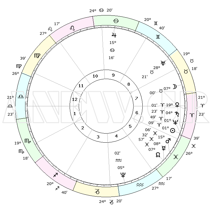| | ΘΕΣΕΙΣ ΠΛΑΝΗΤΩΝ ΑΣΤΡΟΛΟΓΙΚΟΥ ΧΑΡΤΗ ΤΗΣ ΣΤΙΓΜΗΣ ΑΥΤΗΣ | | | | Πλανήτης | Ζώδιο | Μοίρες | Δεκαήμ. | Σε οίκο | Απόκλιση | | Ακμές των οίκων | | Ηλιος | Κριός | 01°05' | Πρώτο | 6 | 00 N 26 | | 1ος | 02°23' | Ζυγός | | Σελήνη | Ταύρος | 06°04' | Πρώτο | 8 | 17 N 42 | | 2ος | 29°09' | Ζυγός | | Ερμής | Ιχθείς | 08°32' | Πρώτο | 6 | 07 S 39 | | 3ος | 29°40' | Σκορπιός | | Αφροδίτη | Κριός | 18°56' | Δεύτερο | 7 | 06 N 38 | | 4ος | 02°41' | Αιγόκερως | | Αρης | Ιχθείς | 15°03' | Δεύτερο | 6 | 06 S 53 | | 5ος | 05°38' | Υδροχόος | | Δίας | Καρκίνος | 15°16' | Δεύτερο | 10 | 22 N 55 | | 6ος | 05°59' | Ιχθείς | | Κρόνος | Κριός | 04°23' | Πρώτο | 7 | 00 S 13 | | 7ος | 02°23' | Κριός | | Ουρανός | Ταύρος | 28°21' | Τρίτο | 8 | 19 N 37 | | 8ος | 29°09' | Κριός | | Ποσειδώνας | Κριός | 01°49' | Πρώτο | 6 | 00 S 29 | | 9ος | 29°40' | Ταύρος | | Πλούτωνας | Υδροχόος | 05°02' | Πρώτο | 4 | 22 S 48 | | 10ος | 02°41' | Καρκίνος | | Β. Δεσμός | Ιχθείς | 07°57' | Πρώτο | 6 | 08 S 35 | | 11ος | 05°38' | Λέων | | Ωροσκόπος | Ζυγός | 02°23' | Πρώτο | | | 12ος | 05°59' | Παρθένος | | Μεσουράνημα | Καρκίνος | 02°41' | Πρώτο | | | |