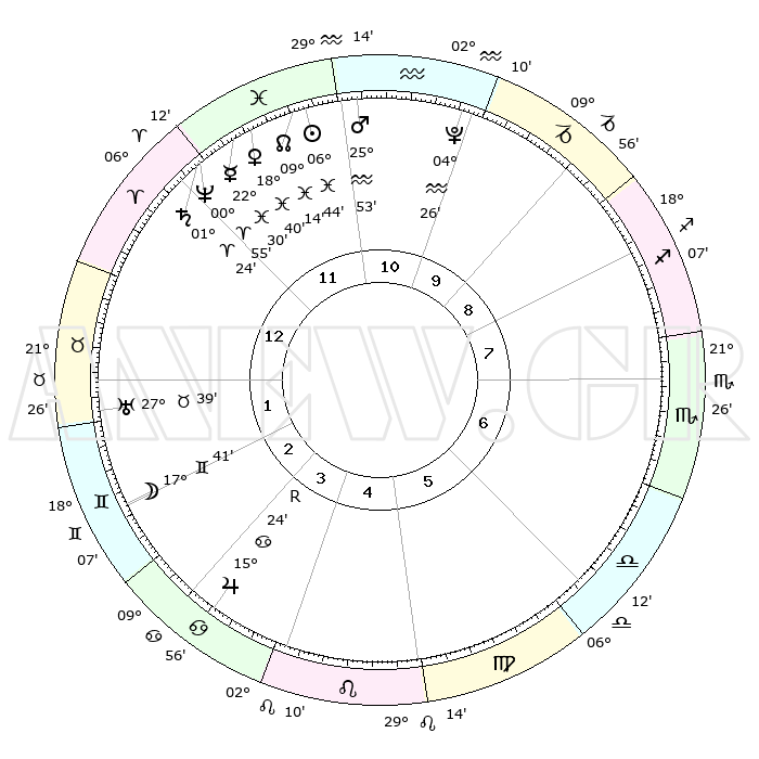 | | ΘΕΣΕΙΣ ΠΛΑΝΗΤΩΝ ΑΣΤΡΟΛΟΓΙΚΟΥ ΧΑΡΤΗ ΤΗΣ ΣΤΙΓΜΗΣ ΑΥΤΗΣ | | | | Πλανήτης | Ζώδιο | Μοίρες | Δεκαήμ. | Σε οίκο | Απόκλιση | | Ακμές των οίκων | | Ηλιος | Ιχθείς | 06°41' | Πρώτο | 12 | 09 S 03 | | 1ος | 19°33' | Κριός | | Σελήνη | Δίδυμοι | 16°48' | Δεύτερο | 2 | 27 N 59 | | 2ος | 24°41' | Ταύρος | | Ερμής | Ιχθείς | 22°29' | Τρίτο | 12 | 00 S 37 | | 3ος | 19°24' | Δίδυμοι | | Αφροδίτη | Ιχθείς | 18°36' | Δεύτερο | 12 | 05 S 48 | | 4ος | 11°09' | Καρκίνος | | Αρης | Υδροχόος | 25°50' | Τρίτο | 11 | 13 S 56 | | 5ος | 04°37' | Λέων | | Δίας | Καρκίνος | 15°24'R | Δεύτερο | 4 | 22 N 53 | | 6ος | 05°20' | Παρθένος | | Κρόνος | Κριός | 01°24' | Πρώτο | 12 | 01 S 24 | | 7ος | 19°33' | Ζυγός | | Ουρανός | Ταύρος | 27°39' | Τρίτο | 2 | 19 N 27 | | 8ος | 24°41' | Σκορπιός | | Ποσειδώνας | Κριός | 00°55' | Πρώτο | 12 | 00 S 50 | | 9ος | 19°24' | Τοξότης | | Πλούτωνας | Υδροχόος | 04°26' | Πρώτο | 10 | 22 S 53 | | 10ος | 11°09' | Αιγόκερως | | Β. Δεσμός | Ιχθείς | 09°15' | Πρώτο | 12 | 08 S 06 | | 11ος | 04°37' | Υδροχόος | | Ωροσκόπος | Κριός | 19°33' | Δεύτερο | | | 12ος | 05°20' | Ιχθείς | | Μεσουράνημα | Αιγόκερως | 11°09' | Δεύτερο | | | |