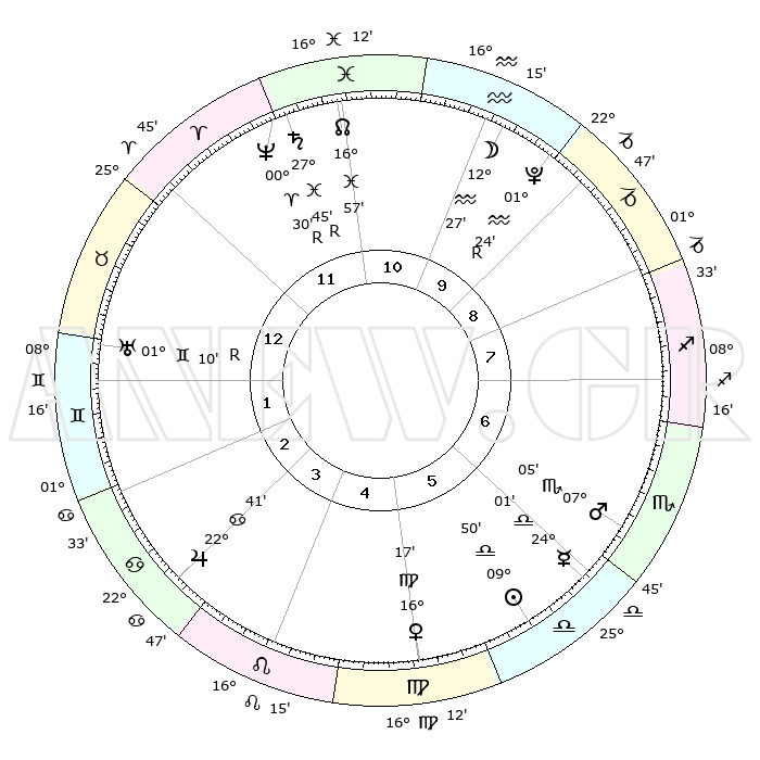 | ΘΕΣΕΙΣ ΠΛΑΝΗΤΩΝ ΑΣΤΡΟΛΟΓΙΚΟΥ ΧΑΡΤΗ ΤΗΣ ΣΤΙΓΜΗΣ ΑΥΤΗΣ | | Πλανήτης | Ζώδιο | Μοίρες | Δεκαήμ. | Σε οίκο | Απόκλιση | | Ακμές των οίκων | Ηλιος | Ζυγός | 09°45' | Πρώτο | 6 | 03 S 52 | | 1ος | 00°40' | Ταύρος | Σελήνη | Υδροχόος | 11°23' | Δεύτερο | 10 | 20 S 23 | | 2ος | 02°42' | Δίδυμοι | Ερμής | Ζυγός | 23°53' | Τρίτο | 6 | 09 S 33 | | 3ος | 26°12' | Δίδυμοι | Αφροδίτη | Παρθένος | 16°11' | Δεύτερο | 6 | 06 N 40 | | 4ος | 17°53' | Καρκίνος | Αρης | Σκορπιός | 07°02' | Πρώτο | 7 | 13 S 57 | | 5ος | 12°21' | Λέων | Δίας | Καρκίνος | 22°40' | Τρίτο | 4 | 21 N 33 | | 6ος | 15°12' | Παρθένος | Κρόνος | Ιχθείς | 27°46'R | Τρίτο | 12 | 03 S 12 | | 7ος | 00°40' | Σκορπιός | Ουρανός | Δίδυμοι | 01°10'R | Πρώτο | 1 | 20 N 11 | | 8ος | 02°42' | Τοξότης | Ποσειδώνας | Κριός | 00°30'R | Πρώτο | 12 | 01 S 04 | | 9ος | 26°12' | Τοξότης | Πλούτωνας | Υδροχόος | 01°24'R | Πρώτο | 10 | 23 S 32 | | 10ος | 17°53' | Αιγόκερως | Β. Δεσμός | Ιχθείς | 16°57' | Δεύτερο | 12 | 05 S 09 | | 11ος | 12°21' | Υδροχόος | Ωροσκόπος | Ταύρος | 00°40' | Πρώτο | | | 12ος | 15°12' | Ιχθείς | Μεσουράνημα | Αιγόκερως | 17°53' | Δεύτερο | | | |