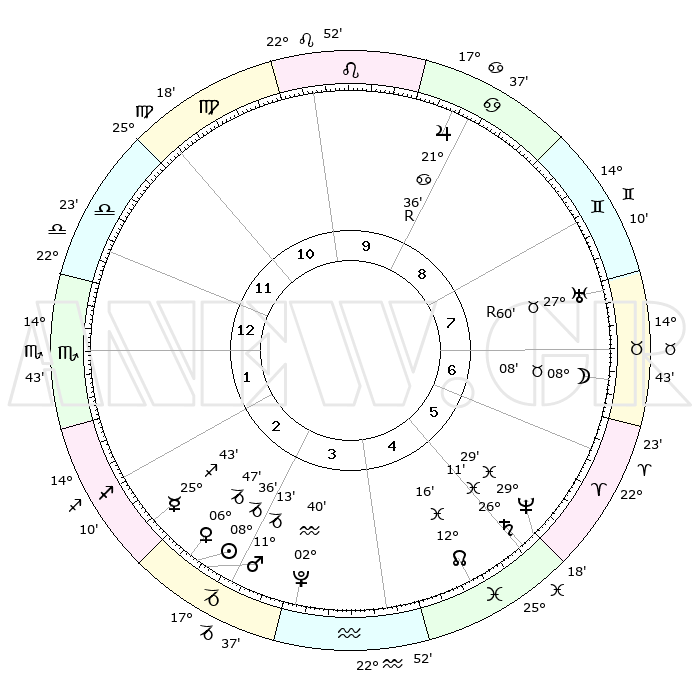 | | ΘΕΣΕΙΣ ΠΛΑΝΗΤΩΝ ΑΣΤΡΟΛΟΓΙΚΟΥ ΧΑΡΤΗ ΤΗΣ ΣΤΙΓΜΗΣ ΑΥΤΗΣ | | | | Πλανήτης | Ζώδιο | Μοίρες | Δεκαήμ. | Σε οίκο | Απόκλιση | | Ακμές των οίκων | | Ηλιος | Αιγόκερως | 08°31' | Πρώτο | 3 | 23 S 10 | | 1ος | 23°20' | Ζυγός | | Σελήνη | Ταύρος | 07°04' | Πρώτο | 7 | 17 N 50 | | 2ος | 21°21' | Σκορπιός | | Ερμής | Τοξότης | 25°36' | Τρίτο | 3 | 23 S 42 | | 3ος | 22°51' | Τοξότης | | Αφροδίτη | Αιγόκερως | 06°41' | Πρώτο | 3 | 23 S 42 | | 4ος | 26°37' | Αιγόκερως | | Αρης | Αιγόκερως | 11°09' | Δεύτερο | 3 | 23 S 50 | | 5ος | 29°34' | Υδροχόος | | Δίας | Καρκίνος | 21°37'R | Τρίτο | 9 | 21 N 56 | | 6ος | 28°47' | Ιχθείς | | Κρόνος | Ιχθείς | 26°10' | Τρίτο | 5 | 03 S 36 | | 7ος | 23°20' | Κριός | | Ουρανός | Ταύρος | 28°00'R | Τρίτο | 8 | 19 N 31 | | 8ος | 21°21' | Ταύρος | | Ποσειδώνας | Ιχθείς | 29°29' | Τρίτο | 6 | 01 S 26 | | 9ος | 22°51' | Δίδυμοι | | Πλούτωνας | Υδροχόος | 02°40' | Πρώτο | 4 | 23 S 14 | | 10ος | 26°37' | Καρκίνος | | Β. Δεσμός | Ιχθείς | 12°17' | Δεύτερο | 5 | 06 S 57 | | 11ος | 29°34' | Λέων | | Ωροσκόπος | Ζυγός | 23°20' | Τρίτο | | | 12ος | 28°47' | Παρθένος | | Μεσουράνημα | Καρκίνος | 26°37' | Τρίτο | | | |