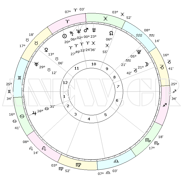 | | ΘΕΣΕΙΣ ΠΛΑΝΗΤΩΝ ΑΣΤΡΟΛΟΓΙΚΟΥ ΧΑΡΤΗ ΤΗΣ ΣΤΙΓΜΗΣ ΑΥΤΗΣ | | | | Πλανήτης | Ζώδιο | Μοίρες | Δεκαήμ. | Σε οίκο | Απόκλιση | | Ακμές των οίκων | | Ηλιος | Κριός | 20°23' | Τρίτο | 12 | 07 N 58 | | 1ος | 26°07' | Ταύρος | | Σελήνη | Αιγόκερως | 20°46' | Τρίτο | 9 | 25 S 35 | | 2ος | 21°45' | Δίδυμοι | | Ερμής | Ιχθείς | 23°30' | Τρίτο | 11 | 04 S 45 | | 3ος | 13°19' | Καρκίνος | | Αφροδίτη | Ταύρος | 12°60' | Δεύτερο | 12 | 15 N 42 | | 4ος | 05°49' | Λέων | | Αρης | Κριός | 00°20' | Πρώτο | 11 | 00 S 47 | | 5ος | 03°38' | Παρθένος | | Δίας | Καρκίνος | 16°30' | Δεύτερο | 3 | 22 N 47 | | 6ος | 11°26' | Ζυγός | | Κρόνος | Κριός | 06°48' | Πρώτο | 11 | 00 N 44 | | 7ος | 26°07' | Σκορπιός | | Ουρανός | Ταύρος | 29°11' | Τρίτο | 1 | 19 N 48 | | 8ος | 21°45' | Τοξότης | | Ποσειδώνας | Κριός | 02°33' | Πρώτο | 11 | 00 S 11 | | 9ος | 13°19' | Αιγόκερως | | Πλούτωνας | Υδροχόος | 05°21' | Πρώτο | 9 | 22 S 47 | | 10ος | 05°49' | Υδροχόος | | Β. Δεσμός | Ιχθείς | 06°55' | Πρώτο | 11 | 08 S 58 | | 11ος | 03°38' | Ιχθείς | | Ωροσκόπος | Ταύρος | 26°07' | Τρίτο | | | 12ος | 11°26' | Κριός | | Μεσουράνημα | Υδροχόος | 05°49' | Πρώτο | | | |