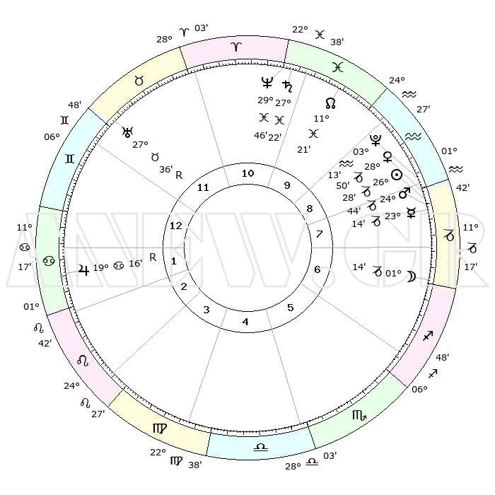 | | ΘΕΣΕΙΣ ΠΛΑΝΗΤΩΝ ΑΣΤΡΟΛΟΓΙΚΟΥ ΧΑΡΤΗ ΤΗΣ ΣΤΙΓΜΗΣ ΑΥΤΗΣ | | | | Πλανήτης | Ζώδιο | Μοίρες | Δεκαήμ. | Σε οίκο | Απόκλιση | | Ακμές των οίκων | | Ηλιος | Αιγόκερως | 26°23' | Τρίτο | 8 | 20 S 52 | | 1ος | 15°07' | Δίδυμοι | | Σελήνη | Αιγόκερως | 00°17' | Πρώτο | 7 | 28 S 14 | | 2ος | 07°22' | Καρκίνος | | Ερμής | Αιγόκερως | 23°07' | Τρίτο | 8 | 23 S 18 | | 3ος | 28°36' | Καρκίνος | | Αφροδίτη | Αιγόκερως | 28°44' | Τρίτο | 9 | 21 S 25 | | 4ος | 22°49' | Λέων | | Αρης | Αιγόκερως | 24°40' | Τρίτο | 8 | 22 S 09 | | 5ος | 24°04' | Παρθένος | | Δίας | Καρκίνος | 19°17'R | Δεύτερο | 2 | 22 N 19 | | 6ος | 04°12' | Σκορπιός | | Κρόνος | Ιχθείς | 27°22' | Τρίτο | 11 | 03 S 05 | | 7ος | 15°07' | Τοξότης | | Ουρανός | Ταύρος | 27°36'R | Τρίτο | 12 | 19 N 26 | | 8ος | 07°22' | Αιγόκερως | | Ποσειδώνας | Ιχθείς | 29°46' | Τρίτο | 11 | 01 S 18 | | 9ος | 28°36' | Αιγόκερως | | Πλούτωνας | Υδροχόος | 03°12' | Πρώτο | 9 | 23 S 07 | | 10ος | 22°49' | Υδροχόος | | Β. Δεσμός | Ιχθείς | 11°21' | Δεύτερο | 10 | 07 S 18 | | 11ος | 24°04' | Ιχθείς | | Ωροσκόπος | Δίδυμοι | 15°07' | Δεύτερο | | | 12ος | 04°12' | Ταύρος | | Μεσουράνημα | Υδροχόος | 22°49' | Τρίτο | | | |