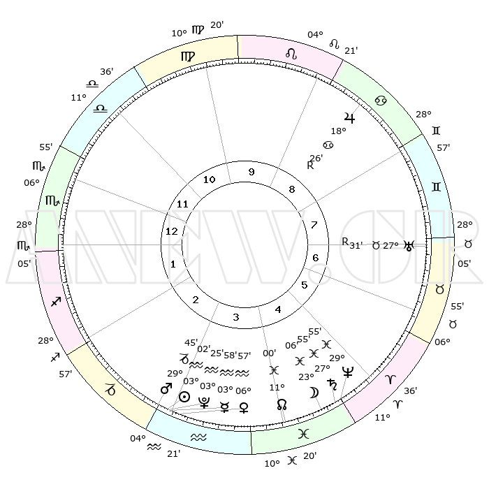 | | ΘΕΣΕΙΣ ΠΛΑΝΗΤΩΝ ΑΣΤΡΟΛΟΓΙΚΟΥ ΧΑΡΤΗ ΤΗΣ ΣΤΙΓΜΗΣ ΑΥΤΗΣ | | | | Πλανήτης | Ζώδιο | Μοίρες | Δεκαήμ. | Σε οίκο | Απόκλιση | | Ακμές των οίκων | | Ηλιος | Υδροχόος | 02°58' | Πρώτο | 3 | 19 S 30 | | 1ος | 08°57' | Σκορπιός | | Σελήνη | Ιχθείς | 22°14' | Τρίτο | 5 | 02 S 01 | | 2ος | 07°57' | Τοξότης | | Ερμής | Υδροχόος | 03°51' | Πρώτο | 3 | 21 S 18 | | 3ος | 10°44' | Αιγόκερως | | Αφροδίτη | Υδροχόος | 06°52' | Πρώτο | 3 | 19 S 42 | | 4ος | 15°34' | Υδροχόος | | Αρης | Αιγόκερως | 29°42' | Τρίτο | 3 | 21 S 12 | | 5ος | 18°17' | Ιχθείς | | Δίας | Καρκίνος | 18°26'R | Δεύτερο | 9 | 22 N 27 | | 6ος | 16°03' | Κριός | | Κρόνος | Ιχθείς | 27°55' | Τρίτο | 5 | 02 S 51 | | 7ος | 08°57' | Ταύρος | | Ουρανός | Ταύρος | 27°31'R | Τρίτο | 7 | 19 N 25 | | 8ος | 07°57' | Δίδυμοι | | Ποσειδώνας | Ιχθείς | 29°55' | Τρίτο | 5 | 01 S 15 | | 9ος | 10°44' | Καρκίνος | | Πλούτωνας | Υδροχόος | 03°25' | Πρώτο | 3 | 23 S 05 | | 10ος | 15°34' | Λέων | | Β. Δεσμός | Ιχθείς | 11°00' | Δεύτερο | 4 | 07 S 26 | | 11ος | 18°17' | Παρθένος | | Ωροσκόπος | Σκορπιός | 08°57' | Πρώτο | | | 12ος | 16°03' | Ζυγός | | Μεσουράνημα | Λέων | 15°34' | Δεύτερο | | | |