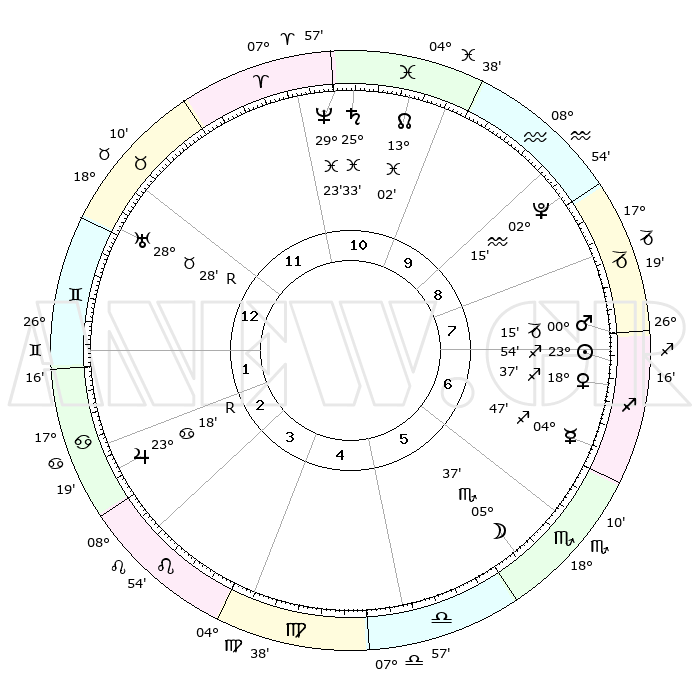 | | ΘΕΣΕΙΣ ΠΛΑΝΗΤΩΝ ΑΣΤΡΟΛΟΓΙΚΟΥ ΧΑΡΤΗ ΤΗΣ ΣΤΙΓΜΗΣ ΑΥΤΗΣ | | | | Πλανήτης | Ζώδιο | Μοίρες | Δεκαήμ. | Σε οίκο | Απόκλιση | | Ακμές των οίκων | | Ηλιος | Τοξότης | 22°59' | Τρίτο | 6 | 23 S 15 | | 1ος | 24°33' | Καρκίνος | | Σελήνη | Ζυγός | 24°50' | Τρίτο | 4 | 12 S 44 | | 2ος | 15°17' | Λέων | | Ερμής | Τοξότης | 03°34' | Πρώτο | 5 | 19 S 19 | | 3ος | 09°36' | Παρθένος | | Αφροδίτη | Τοξότης | 17°29' | Δεύτερο | 5 | 22 S 40 | | 4ος | 09°54' | Ζυγός | | Αρης | Τοξότης | 29°34' | Τρίτο | 6 | 24 S 12 | | 5ος | 15°59' | Σκορπιός | | Δίας | Καρκίνος | 23°24'R | Τρίτο | 12 | 21 N 36 | | 6ος | 22°37' | Τοξότης | | Κρόνος | Ιχθείς | 25°31' | Τρίτο | 9 | 03 S 54 | | 7ος | 24°33' | Αιγόκερως | | Ουρανός | Ταύρος | 28°30'R | Τρίτο | 11 | 19 N 37 | | 8ος | 15°17' | Υδροχόος | | Ποσειδώνας | Ιχθείς | 29°23' | Τρίτο | 9 | 01 S 29 | | 9ος | 09°36' | Ιχθείς | | Πλούτωνας | Υδροχόος | 02°14' | Πρώτο | 7 | 23 S 20 | | 10ος | 09°54' | Κριός | | Β. Δεσμός | Ιχθείς | 13°05' | Δεύτερο | 9 | 06 S 39 | | 11ος | 15°59' | Ταύρος | | Ωροσκόπος | Καρκίνος | 24°33' | Τρίτο | | | 12ος | 22°37' | Δίδυμοι | | Μεσουράνημα | Κριός | 09°54' | Πρώτο | | | |