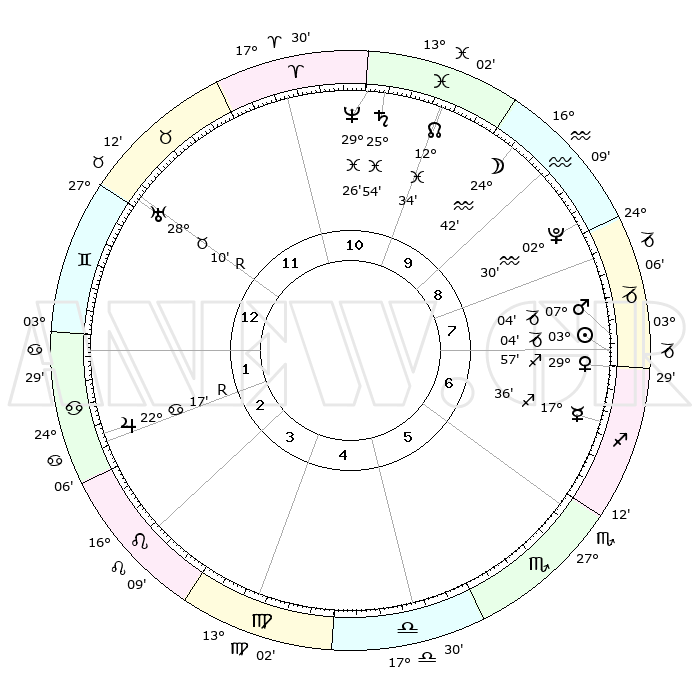 | | ΘΕΣΕΙΣ ΠΛΑΝΗΤΩΝ ΑΣΤΡΟΛΟΓΙΚΟΥ ΧΑΡΤΗ ΤΗΣ ΣΤΙΓΜΗΣ ΑΥΤΗΣ | | | | Πλανήτης | Ζώδιο | Μοίρες | Δεκαήμ. | Σε οίκο | Απόκλιση | | Ακμές των οίκων | | Ηλιος | Αιγόκερως | 02°59' | Πρώτο | 8 | 23 S 24 | | 1ος | 07°16' | Δίδυμοι | | Σελήνη | Υδροχόος | 23°45' | Τρίτο | 10 | 15 S 02 | | 2ος | 00°43' | Καρκίνος | | Ερμής | Τοξότης | 17°29' | Δεύτερο | 7 | 22 S 32 | | 3ος | 21°57' | Καρκίνος | | Αφροδίτη | Τοξότης | 29°51' | Τρίτο | 7 | 23 S 39 | | 4ος | 15°19' | Λέων | | Αρης | Αιγόκερως | 07°01' | Πρώτο | 8 | 24 S 05 | | 5ος | 15°06' | Παρθένος | | Δίας | Καρκίνος | 22°18'R | Τρίτο | 3 | 21 N 48 | | 6ος | 24°32' | Ζυγός | | Κρόνος | Ιχθείς | 25°54' | Τρίτο | 11 | 03 S 44 | | 7ος | 07°16' | Τοξότης | | Ουρανός | Ταύρος | 28°10'R | Τρίτο | 12 | 19 N 33 | | 8ος | 00°43' | Αιγόκερως | | Ποσειδώνας | Ιχθείς | 29°26' | Τρίτο | 11 | 01 S 27 | | 9ος | 21°57' | Αιγόκερως | | Πλούτωνας | Υδροχόος | 02°30' | Πρώτο | 9 | 23 S 16 | | 10ος | 15°19' | Υδροχόος | | Β. Δεσμός | Ιχθείς | 12°34' | Δεύτερο | 10 | 06 S 51 | | 11ος | 15°06' | Ιχθείς | | Ωροσκόπος | Δίδυμοι | 07°16' | Πρώτο | | | 12ος | 24°32' | Κριός | | Μεσουράνημα | Υδροχόος | 15°19' | Δεύτερο | | | |