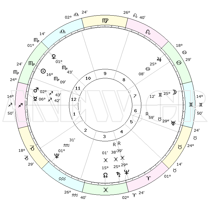 | | ΘΕΣΕΙΣ ΠΛΑΝΗΤΩΝ ΑΣΤΡΟΛΟΓΙΚΟΥ ΧΑΡΤΗ ΤΗΣ ΣΤΙΓΜΗΣ ΑΥΤΗΣ | | | | Πλανήτης | Ζώδιο | Μοίρες | Δεκαήμ. | Σε οίκο | Απόκλιση | | Ακμές των οίκων | | Ηλιος | Σκορπιός | 16°02' | Δεύτερο | 1 | 16 S 38 | | 1ος | 12°49' | Σκορπιός | | Σελήνη | Δίδυμοι | 23°35' | Τρίτο | 8 | 28 N 18 | | 2ος | 12°06' | Τοξότης | | Ερμής | Τοξότης | 06°41' | Πρώτο | 1 | 23 S 57 | | 3ος | 15°19' | Αιγόκερως | | Αφροδίτη | Σκορπιός | 01°35' | Πρώτο | 12 | 10 S 45 | | 4ος | 20°27' | Υδροχόος | | Αρης | Τοξότης | 02°38' | Πρώτο | 1 | 21 S 08 | | 5ος | 22°59' | Ιχθείς | | Δίας | Καρκίνος | 25°08' | Τρίτο | 9 | 21 N 12 | | 6ος | 20°18' | Κριός | | Κρόνος | Ιχθείς | 25°38'R | Τρίτο | 5 | 03 S 59 | | 7ος | 12°49' | Ταύρος | | Ουρανός | Ταύρος | 29°59'R | Τρίτο | 7 | 19 N 56 | | 8ος | 12°06' | Δίδυμοι | | Ποσειδώνας | Ιχθείς | 29°39'R | Τρίτο | 5 | 01 S 23 | | 9ος | 15°19' | Καρκίνος | | Πλούτωνας | Υδροχόος | 01°31' | Πρώτο | 3 | 23 S 30 | | 10ος | 20°27' | Λέων | | Β. Δεσμός | Ιχθείς | 15°01' | Δεύτερο | 4 | 05 S 54 | | 11ος | 22°59' | Παρθένος | | Ωροσκόπος | Σκορπιός | 12°49' | Δεύτερο | | | 12ος | 20°18' | Ζυγός | | Μεσουράνημα | Λέων | 20°27' | Τρίτο | | | |