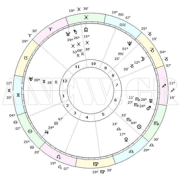 | | ΘΕΣΕΙΣ ΠΛΑΝΗΤΩΝ ΑΣΤΡΟΛΟΓΙΚΟΥ ΧΑΡΤΗ ΤΗΣ ΣΤΙΓΜΗΣ ΑΥΤΗΣ | | | | Πλανήτης | Ζώδιο | Μοίρες | Δεκαήμ. | Σε οίκο | Απόκλιση | | Ακμές των οίκων | | Ηλιος | Σκορπιός | 04°26' | Πρώτο | 7 | 13 S 00 | | 1ος | 19°15' | Κριός | | Σελήνη | Αιγόκερως | 11°00' | Δεύτερο | 10 | 27 S 39 | | 2ος | 24°28' | Ταύρος | | Ερμής | Σκορπιός | 28°04' | Τρίτο | 8 | 22 S 26 | | 3ος | 19°13' | Δίδυμοι | | Αφροδίτη | Ζυγός | 17°06' | Δεύτερο | 6 | 05 S 19 | | 4ος | 10°58' | Καρκίνος | | Αρης | Σκορπιός | 24°22' | Τρίτο | 7 | 19 S 12 | | 5ος | 04°26' | Λέων | | Δίας | Καρκίνος | 24°47' | Τρίτο | 4 | 21 N 14 | | 6ος | 05°05' | Παρθένος | | Κρόνος | Ιχθείς | 26°08'R | Τρίτο | 12 | 03 S 49 | | 7ος | 19°15' | Ζυγός | | Ουρανός | Δίδυμοι | 00°26'R | Πρώτο | 2 | 20 N 02 | | 8ος | 24°28' | Σκορπιός | | Ποσειδώνας | Ιχθείς | 29°53'R | Τρίτο | 12 | 01 S 18 | | 9ος | 19°14' | Τοξότης | | Πλούτωνας | Υδροχόος | 01°25' | Πρώτο | 10 | 23 S 31 | | 10ος | 10°58' | Αιγόκερως | | Β. Δεσμός | Ιχθείς | 15°38' | Δεύτερο | 12 | 05 S 40 | | 11ος | 04°26' | Υδροχόος | | Ωροσκόπος | Κριός | 19°15' | Δεύτερο | | | 12ος | 05°05' | Ιχθείς | | Μεσουράνημα | Αιγόκερως | 10°58' | Δεύτερο | | | |