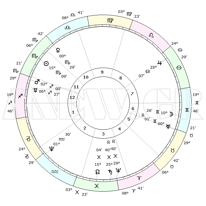 | | ΘΕΣΕΙΣ ΠΛΑΝΗΤΩΝ ΑΣΤΡΟΛΟΓΙΚΟΥ ΧΑΡΤΗ ΤΗΣ ΣΤΙΓΜΗΣ ΑΥΤΗΣ | | | | Πλανήτης | Ζώδιο | Μοίρες | Δεκαήμ. | Σε οίκο | Απόκλιση | | Ακμές των οίκων | | Ηλιος | Σκορπιός | 15°04' | Δεύτερο | 12 | 16 S 21 | | 1ος | 22°41' | Σκορπιός | | Σελήνη | Δίδυμοι | 09°03' | Πρώτο | 7 | 26 N 46 | | 2ος | 22°54' | Τοξότης | | Ερμής | Τοξότης | 06°25' | Πρώτο | 1 | 24 S 00 | | 3ος | 27°27' | Αιγόκερως | | Αφροδίτη | Σκορπιός | 00°23' | Πρώτο | 11 | 10 S 19 | | 4ος | 03°13' | Ιχθείς | | Αρης | Τοξότης | 01°57' | Πρώτο | 1 | 20 S 59 | | 5ος | 05°03' | Κριός | | Δίας | Καρκίνος | 25°07' | Τρίτο | 8 | 21 N 12 | | 6ος | 01°05' | Ταύρος | | Κρόνος | Ιχθείς | 25°40'R | Τρίτο | 4 | 03 S 58 | | 7ος | 22°41' | Ταύρος | | Ουρανός | Δίδυμοι | 00°02'R | Πρώτο | 7 | 19 N 57 | | 8ος | 22°54' | Δίδυμοι | | Ποσειδώνας | Ιχθείς | 29°40'R | Τρίτο | 4 | 01 S 23 | | 9ος | 27°27' | Καρκίνος | | Πλούτωνας | Υδροχόος | 01°30' | Πρώτο | 3 | 23 S 30 | | 10ος | 03°13' | Παρθένος | | Β. Δεσμός | Ιχθείς | 15°04' | Δεύτερο | 4 | 05 S 53 | | 11ος | 05°03' | Ζυγός | | Ωροσκόπος | Σκορπιός | 22°41' | Τρίτο | | | 12ος | 01°05' | Σκορπιός | | Μεσουράνημα | Παρθένος | 03°13' | Πρώτο | | | |