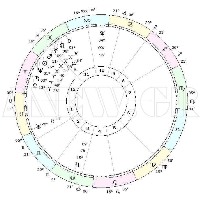 | | ΘΕΣΕΙΣ ΠΛΑΝΗΤΩΝ ΑΣΤΡΟΛΟΓΙΚΟΥ ΧΑΡΤΗ ΤΗΣ ΣΤΙΓΜΗΣ ΑΥΤΗΣ | | | | Πλανήτης | Ζώδιο | Μοίρες | Δεκαήμ. | Σε οίκο | Απόκλιση | | Ακμές των οίκων | | Ηλιος | Ιχθείς | 26°35' | Τρίτο | 1 | 01 S 21 | | 1ος | 16°33' | Ιχθείς | | Σελήνη | Ιχθείς | 02°45' | Πρώτο | 12 | 11 S 02 | | 2ος | 29°44' | Κριός | | Ερμής | Ιχθείς | 09°10'R | Πρώτο | 12 | 06 S 23 | | 3ος | 29°21' | Ταύρος | | Αφροδίτη | Κριός | 13°20' | Δεύτερο | 1 | 04 N 21 | | 4ος | 22°24' | Δίδυμοι | | Αρης | Ιχθείς | 11°30' | Δεύτερο | 12 | 08 S 15 | | 5ος | 14°15' | Καρκίνος | | Δίας | Καρκίνος | 15°09' | Δεύτερο | 5 | 22 N 56 | | 6ος | 09°44' | Λέων | | Κρόνος | Κριός | 03°49' | Πρώτο | 1 | 00 S 26 | | 7ος | 16°33' | Παρθένος | | Ουρανός | Ταύρος | 28°11' | Τρίτο | 2 | 19 N 35 | | 8ος | 29°44' | Ζυγός | | Ποσειδώνας | Κριός | 01°39' | Πρώτο | 1 | 00 S 33 | | 9ος | 29°21' | Σκορπιός | | Πλούτωνας | Υδροχόος | 04°56' | Πρώτο | 11 | 22 S 49 | | 10ος | 22°24' | Τοξότης | | Β. Δεσμός | Ιχθείς | 08°11' | Πρώτο | 12 | 08 S 30 | | 11ος | 14°15' | Αιγόκερως | | Ωροσκόπος | Ιχθείς | 16°33' | Δεύτερο | | | 12ος | 09°44' | Υδροχόος | | Μεσουράνημα | Τοξότης | 22°24' | Τρίτο | | | |
