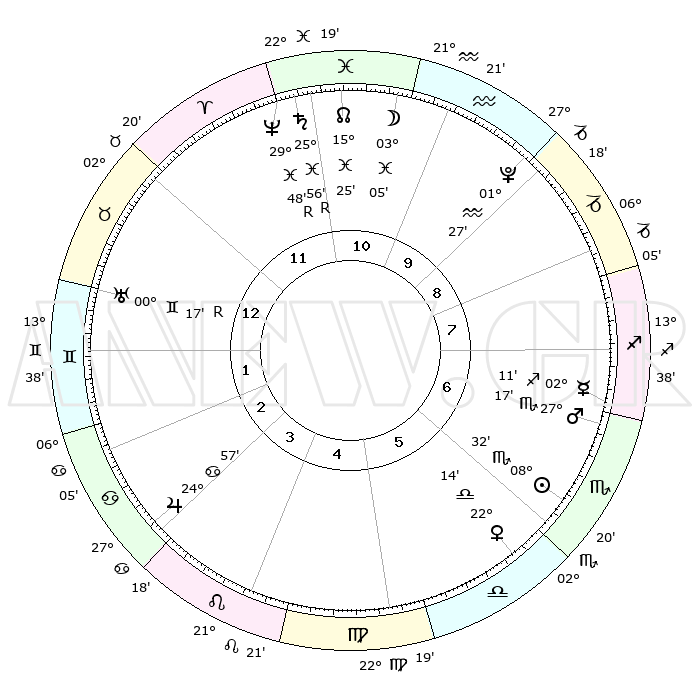 |  | ΘΕΣΕΙΣ ΠΛΑΝΗΤΩΝ ΑΣΤΡΟΛΟΓΙΚΟΥ ΧΑΡΤΗ ΤΗΣ ΣΤΙΓΜΗΣ ΑΥΤΗΣ |  |  |  | | Πλανήτης | Ζώδιο | Μοίρες | Δεκαήμ. | Σε οίκο | Απόκλιση |  | Ακμές των οίκων |  | Ηλιος | Σκορπιός | 08°16' | Πρώτο | 9 | 14 S 16 |  | 1ος | 27°14' | Αιγόκερως |  | Σελήνη | Υδροχόος | 29°28' | Τρίτο | 1 | 13 S 07 |  | 2ος | 10°51' | Ιχθείς |  | Ερμής | Τοξότης | 01°56' | Πρώτο | 10 | 23 S 23 |  | 3ος | 19°43' | Κριός |  | Αφροδίτη | Ζυγός | 21°53' | Τρίτο | 9 | 07 S 09 |  | 4ος | 18°40' | Ταύρος |  | Αρης | Σκορπιός | 27°05' | Τρίτο | 10 | 19 S 53 |  | 5ος | 11°38' | Δίδυμοι |  | Δίας | Καρκίνος | 24°57' | Τρίτο | 6 | 21 N 13 |  | 6ος | 02°58' | Καρκίνος |  | Κρόνος | Ιχθείς | 25°57'R | Τρίτο | 2 | 03 S 52 |  | 7ος | 27°14' | Καρκίνος |  | Ουρανός | Δίδυμοι | 00°18'R | Πρώτο | 4 | 20 N 00 |  | 8ος | 10°51' | Παρθένος |  | Ποσειδώνας | Ιχθείς | 29°48'R | Τρίτο | 2 | 01 S 20 |  | 9ος | 19°43' | Ζυγός |  | Πλούτωνας | Υδροχόος | 01°26' | Πρώτο | 1 | 23 S 31 |  | 10ος | 18°40' | Σκορπιός |  | Β. Δεσμός | Ιχθείς | 15°26' | Δεύτερο | 2 | 05 S 45 |  | 11ος | 11°38' | Τοξότης |  | Ωροσκόπος | Αιγόκερως | 27°14' | Τρίτο |  |  | 12ος | 02°58' | Αιγόκερως |  | Μεσουράνημα | Σκορπιός | 18°40' | Δεύτερο |  |  |  |
