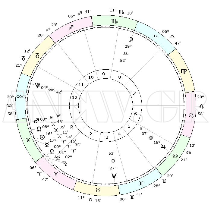 | | ΘΕΣΕΙΣ ΠΛΑΝΗΤΩΝ ΑΣΤΡΟΛΟΓΙΚΟΥ ΧΑΡΤΗ ΤΗΣ ΣΤΙΓΜΗΣ ΑΥΤΗΣ | | | | Πλανήτης | Ζώδιο | Μοίρες | Δεκαήμ. | Σε οίκο | Απόκλιση | | Ακμές των οίκων | | Ηλιος | Ιχθείς | 16°29' | Δεύτερο | 2 | 05 S 20 | | 1ος | 08°02' | Αιγόκερως | | Σελήνη | Ζυγός | 28°37' | Τρίτο | 9 | 14 S 44 | | 2ος | 17°14' | Υδροχόος | | Ερμής | Ιχθείς | 17°17'R | Δεύτερο | 2 | 01 S 39 | | 3ος | 27°32' | Ιχθείς | | Αφροδίτη | Κριός | 00°46' | Πρώτο | 3 | 00 S 50 | | 4ος | 00°05' | Ταύρος | | Αρης | Ιχθείς | 03°31' | Πρώτο | 2 | 11 S 14 | | 5ος | 25°12' | Ταύρος | | Δίας | Καρκίνος | 15°07'R | Δεύτερο | 7 | 22 N 56 | | 6ος | 16°35' | Δίδυμοι | | Κρόνος | Κριός | 02°34' | Πρώτο | 3 | 00 S 56 | | 7ος | 08°02' | Καρκίνος | | Ουρανός | Ταύρος | 27°53' | Τρίτο | 5 | 19 N 30 | | 8ος | 17°14' | Λέων | | Ποσειδώνας | Κριός | 01°16' | Πρώτο | 3 | 00 S 42 | | 9ος | 27°32' | Παρθένος | | Πλούτωνας | Υδροχόος | 04°42' | Πρώτο | 1 | 22 S 51 | | 10ος | 00°05' | Σκορπιός | | Β. Δεσμός | Ιχθείς | 08°43' | Πρώτο | 2 | 08 S 18 | | 11ος | 25°12' | Σκορπιός | | Ωροσκόπος | Αιγόκερως | 08°02' | Πρώτο | | | 12ος | 16°35' | Τοξότης | | Μεσουράνημα | Σκορπιός | 00°05' | Πρώτο | | | |
