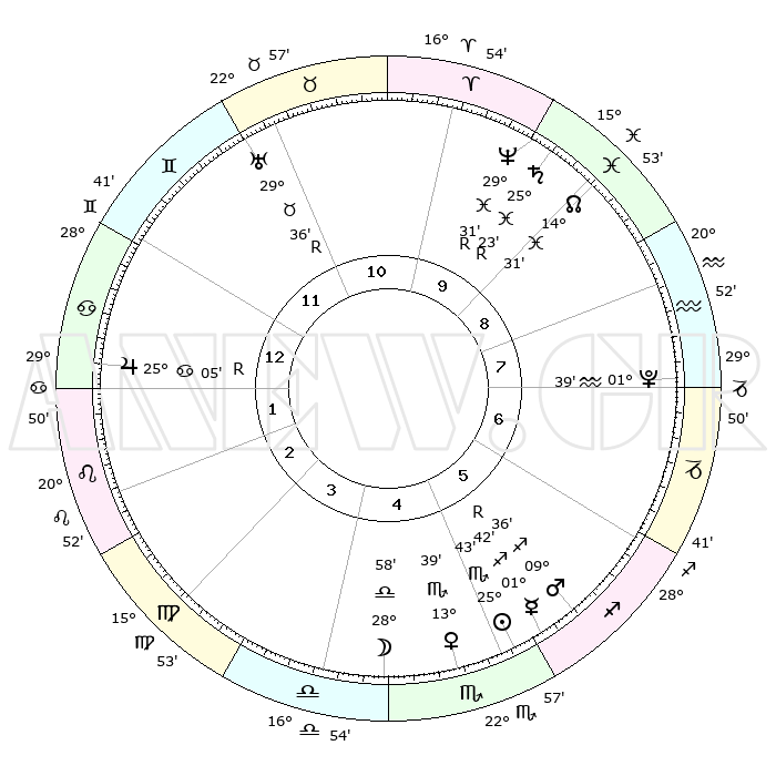 | | ΘΕΣΕΙΣ ΠΛΑΝΗΤΩΝ ΑΣΤΡΟΛΟΓΙΚΟΥ ΧΑΡΤΗ ΤΗΣ ΣΤΙΓΜΗΣ ΑΥΤΗΣ | | | | Πλανήτης | Ζώδιο | Μοίρες | Δεκαήμ. | Σε οίκο | Απόκλιση | | Ακμές των οίκων | | Ηλιος | Σκορπιός | 25°38' | Τρίτο | 5 | 19 S 10 | | 1ος | 03°09' | Καρκίνος | | Σελήνη | Ζυγός | 27°55' | Τρίτο | 5 | 13 S 53 | | 2ος | 23°47' | Καρκίνος | | Ερμής | Τοξότης | 01°48'R | Πρώτο | 6 | 20 S 53 | | 3ος | 15°48' | Λέων | | Αφροδίτη | Σκορπιός | 13°32' | Δεύτερο | 5 | 14 S 49 | | 4ος | 12°38' | Παρθένος | | Αρης | Τοξότης | 09°33' | Πρώτο | 6 | 22 S 25 | | 5ος | 17°03' | Ζυγός | | Δίας | Καρκίνος | 25°05'R | Τρίτο | 2 | 21 N 14 | | 6ος | 26°47' | Σκορπιός | | Κρόνος | Ιχθείς | 25°23'R | Τρίτο | 10 | 04 S 03 | | 7ος | 03°09' | Αιγόκερως | | Ουρανός | Ταύρος | 29°36'R | Τρίτο | 12 | 19 N 51 | | 8ος | 23°47' | Αιγόκερως | | Ποσειδώνας | Ιχθείς | 29°31'R | Τρίτο | 10 | 01 S 26 | | 9ος | 15°48' | Υδροχόος | | Πλούτωνας | Υδροχόος | 01°39' | Πρώτο | 8 | 23 S 28 | | 10ος | 12°38' | Ιχθείς | | Β. Δεσμός | Ιχθείς | 14°31' | Δεύτερο | 10 | 06 S 06 | | 11ος | 17°03' | Κριός | | Ωροσκόπος | Καρκίνος | 03°09' | Πρώτο | | | 12ος | 26°47' | Ταύρος | | Μεσουράνημα | Ιχθείς | 12°38' | Δεύτερο | | | |