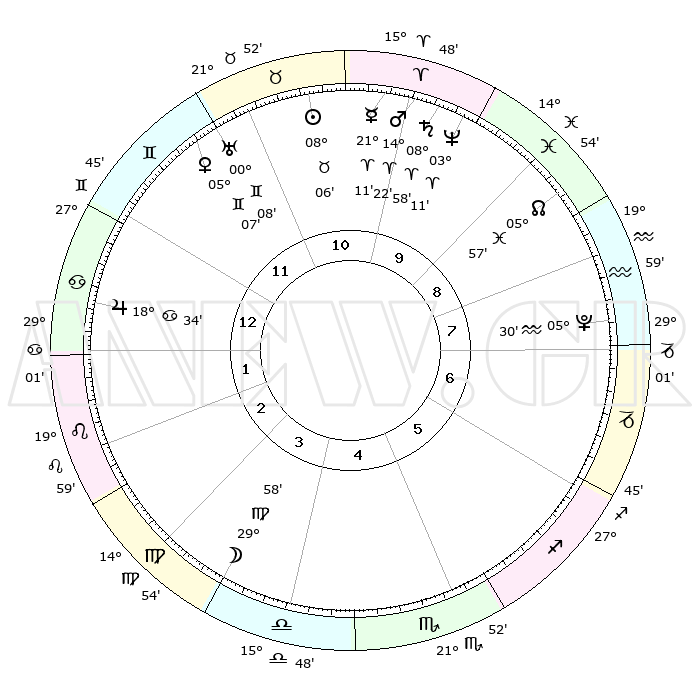 | | ΘΕΣΕΙΣ ΠΛΑΝΗΤΩΝ ΑΣΤΡΟΛΟΓΙΚΟΥ ΧΑΡΤΗ ΤΗΣ ΣΤΙΓΜΗΣ ΑΥΤΗΣ | | | | Πλανήτης | Ζώδιο | Μοίρες | Δεκαήμ. | Σε οίκο | Απόκλιση | | Ακμές των οίκων | | Ηλιος | Ταύρος | 08°01' | Πρώτο | 11 | 14 N 11 | | 1ος | 05°23' | Καρκίνος | | Σελήνη | Παρθένος | 28°59' | Τρίτο | 4 | 01 S 19 | | 2ος | 25°55' | Καρκίνος | | Ερμής | Κριός | 21°03' | Τρίτο | 11 | 06 N 11 | | 3ος | 18°08' | Λέων | | Αφροδίτη | Δίδυμοι | 05°01' | Πρώτο | 12 | 21 N 54 | | 4ος | 15°19' | Παρθένος | | Αρης | Κριός | 14°19' | Δεύτερο | 10 | 04 N 48 | | 5ος | 20°03' | Ζυγός | | Δίας | Καρκίνος | 18°33' | Δεύτερο | 1 | 22 N 32 | | 6ος | 29°34' | Σκορπιός | | Κρόνος | Κριός | 08°57' | Πρώτο | 10 | 01 N 33 | | 7ος | 05°23' | Αιγόκερως | | Ουρανός | Δίδυμοι | 00°08' | Πρώτο | 12 | 20 N 01 | | 8ος | 25°55' | Αιγόκερως | | Ποσειδώνας | Κριός | 03°11' | Πρώτο | 10 | 00 N 03 | | 9ος | 18°08' | Υδροχόος | | Πλούτωνας | Υδροχόος | 05°30' | Πρώτο | 8 | 22 S 48 | | 10ος | 15°19' | Ιχθείς | | Β. Δεσμός | Ιχθείς | 05°57' | Πρώτο | 9 | 09 S 19 | | 11ος | 20°03' | Κριός | | Ωροσκόπος | Καρκίνος | 05°23' | Πρώτο | | | 12ος | 29°34' | Ταύρος | | Μεσουράνημα | Ιχθείς | 15°19' | Δεύτερο | | | |
