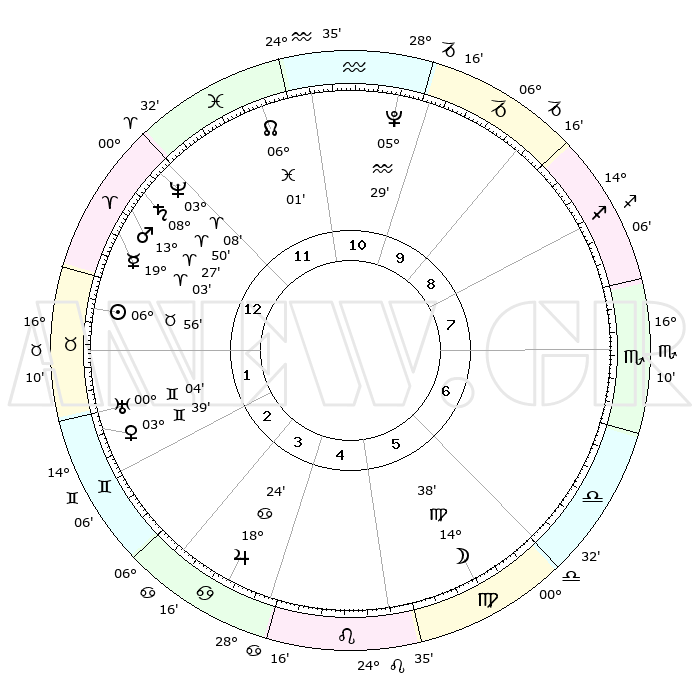 | | ΘΕΣΕΙΣ ΠΛΑΝΗΤΩΝ ΑΣΤΡΟΛΟΓΙΚΟΥ ΧΑΡΤΗ ΤΗΣ ΣΤΙΓΜΗΣ ΑΥΤΗΣ | | | | Πλανήτης | Ζώδιο | Μοίρες | Δεκαήμ. | Σε οίκο | Απόκλιση | | Ακμές των οίκων | | Ηλιος | Ταύρος | 06°52' | Πρώτο | 1 | 13 N 48 | | 1ος | 13°07' | Κριός | | Σελήνη | Παρθένος | 13°50' | Δεύτερο | 6 | 05 N 49 | | 2ος | 20°01' | Ταύρος | | Ερμής | Κριός | 18°57' | Δεύτερο | 1 | 05 N 18 | | 3ος | 15°33' | Δίδυμοι | | Αφροδίτη | Δίδυμοι | 03°35' | Πρώτο | 2 | 21 N 35 | | 4ος | 07°24' | Καρκίνος | | Αρης | Κριός | 13°24' | Δεύτερο | 1 | 04 N 27 | | 5ος | 00°26' | Λέων | | Δίας | Καρκίνος | 18°23' | Δεύτερο | 4 | 22 N 33 | | 6ος | 29°59' | Λέων | | Κρόνος | Κριός | 08°49' | Πρώτο | 12 | 01 N 30 | | 7ος | 13°07' | Ζυγός | | Ουρανός | Δίδυμοι | 00°04' | Πρώτο | 2 | 20 N 00 | | 8ος | 20°01' | Σκορπιός | | Ποσειδώνας | Κριός | 03°08' | Πρώτο | 12 | 00 N 02 | | 9ος | 15°33' | Τοξότης | | Πλούτωνας | Υδροχόος | 05°29' | Πρώτο | 11 | 22 S 48 | | 10ος | 07°24' | Αιγόκερως | | Β. Δεσμός | Ιχθείς | 06°01' | Πρώτο | 12 | 09 S 18 | | 11ος | 00°26' | Υδροχόος | | Ωροσκόπος | Κριός | 13°07' | Δεύτερο | | | 12ος | 29°59' | Υδροχόος | | Μεσουράνημα | Αιγόκερως | 07°24' | Πρώτο | | | |