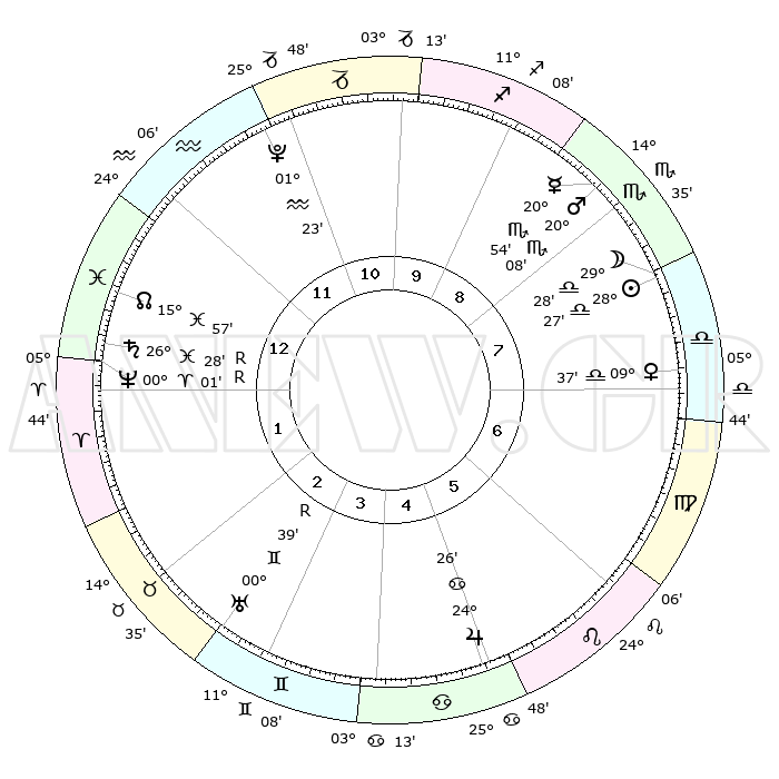 | ΘΕΣΕΙΣ ΠΛΑΝΗΤΩΝ ΑΣΤΡΟΛΟΓΙΚΟΥ ΧΑΡΤΗ ΤΗΣ ΣΤΙΓΜΗΣ ΑΥΤΗΣ | | Πλανήτης | Ζώδιο | Μοίρες | Δεκαήμ. | Σε οίκο | Απόκλιση | | Ακμές των οίκων | Ηλιος | Ζυγός | 28°21' | Τρίτο | 8 | 10 S 53 | | 1ος | 10°36' | Υδροχόος | Σελήνη | Ζυγός | 28°16' | Τρίτο | 8 | 13 S 59 | | 2ος | 26°01' | Ιχθείς | Ερμής | Σκορπιός | 20°46' | Τρίτο | 9 | 20 S 13 | | 3ος | 02°36' | Ταύρος | Αφροδίτη | Ζυγός | 09°29' | Πρώτο | 8 | 02 S 21 | | 4ος | 29°22' | Ταύρος | Αρης | Σκορπιός | 20°03' | Τρίτο | 9 | 18 S 02 | | 5ος | 21°30' | Δίδυμοι | Δίας | Καρκίνος | 24°26' | Τρίτο | 6 | 21 N 17 | | 6ος | 13°27' | Καρκίνος | Κρόνος | Ιχθείς | 26°29'R | Τρίτο | 2 | 03 S 41 | | 7ος | 10°36' | Λέων | Ουρανός | Δίδυμοι | 00°39'R | Πρώτο | 4 | 20 N 04 | | 8ος | 26°01' | Παρθένος | Ποσειδώνας | Κριός | 00°01'R | Πρώτο | 2 | 01 S 15 | | 9ος | 02°36' | Σκορπιός | Πλούτωνας | Υδροχόος | 01°23' | Πρώτο | 12 | 23 S 32 | | 10ος | 29°22' | Σκορπιός | Β. Δεσμός | Ιχθείς | 15°57' | Δεύτερο | 1 | 05 S 32 | | 11ος | 21°30' | Τοξότης | Ωροσκόπος | Υδροχόος | 10°36' | Δεύτερο | | | 12ος | 13°27' | Αιγόκερως | Μεσουράνημα | Σκορπιός | 29°22' | Τρίτο | | | |