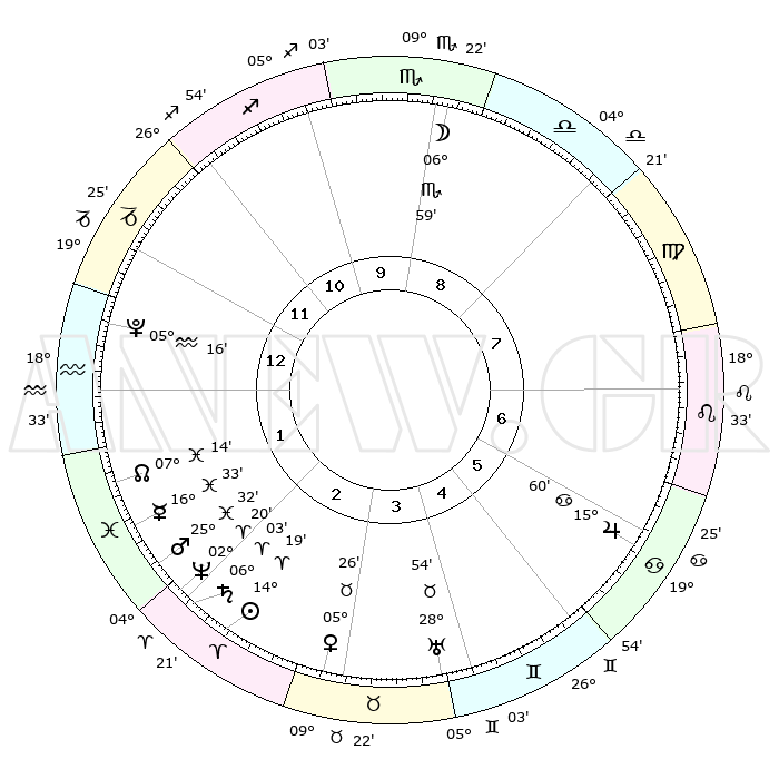 | | ΘΕΣΕΙΣ ΠΛΑΝΗΤΩΝ ΑΣΤΡΟΛΟΓΙΚΟΥ ΧΑΡΤΗ ΤΗΣ ΣΤΙΓΜΗΣ ΑΥΤΗΣ | | | | Πλανήτης | Ζώδιο | Μοίρες | Δεκαήμ. | Σε οίκο | Απόκλιση | | Ακμές των οίκων | | Ηλιος | Κριός | 14°16' | Δεύτερο | 2 | 05 N 37 | | 1ος | 23°07' | Αιγόκερως | | Σελήνη | Σκορπιός | 06°17' | Πρώτο | 9 | 17 S 44 | | 2ος | 05°55' | Ιχθείς | | Ερμής | Ιχθείς | 16°29' | Δεύτερο | 2 | 06 S 56 | | 3ος | 15°19' | Κριός | | Αφροδίτη | Ταύρος | 05°22' | Πρώτο | 3 | 13 N 00 | | 4ος | 15°01' | Ταύρος | | Αρης | Ιχθείς | 25°29' | Τρίτο | 2 | 02 S 45 | | 5ος | 08°21' | Δίδυμοι | | Δίας | Καρκίνος | 15°59' | Δεύτερο | 6 | 22 N 51 | | 6ος | 29°36' | Δίδυμοι | | Κρόνος | Κριός | 06°02' | Πρώτο | 2 | 00 N 26 | | 7ος | 23°07' | Καρκίνος | | Ουρανός | Ταύρος | 28°54' | Τρίτο | 4 | 19 N 44 | | 8ος | 05°55' | Παρθένος | | Ποσειδώνας | Κριός | 02°19' | Πρώτο | 2 | 00 S 17 | | 9ος | 15°19' | Ζυγός | | Πλούτωνας | Υδροχόος | 05°16' | Πρώτο | 1 | 22 S 47 | | 10ος | 15°01' | Σκορπιός | | Β. Δεσμός | Ιχθείς | 07°15' | Πρώτο | 2 | 08 S 51 | | 11ος | 08°21' | Τοξότης | | Ωροσκόπος | Αιγόκερως | 23°07' | Τρίτο | | | 12ος | 29°36' | Τοξότης | | Μεσουράνημα | Σκορπιός | 15°01' | Δεύτερο | | | |