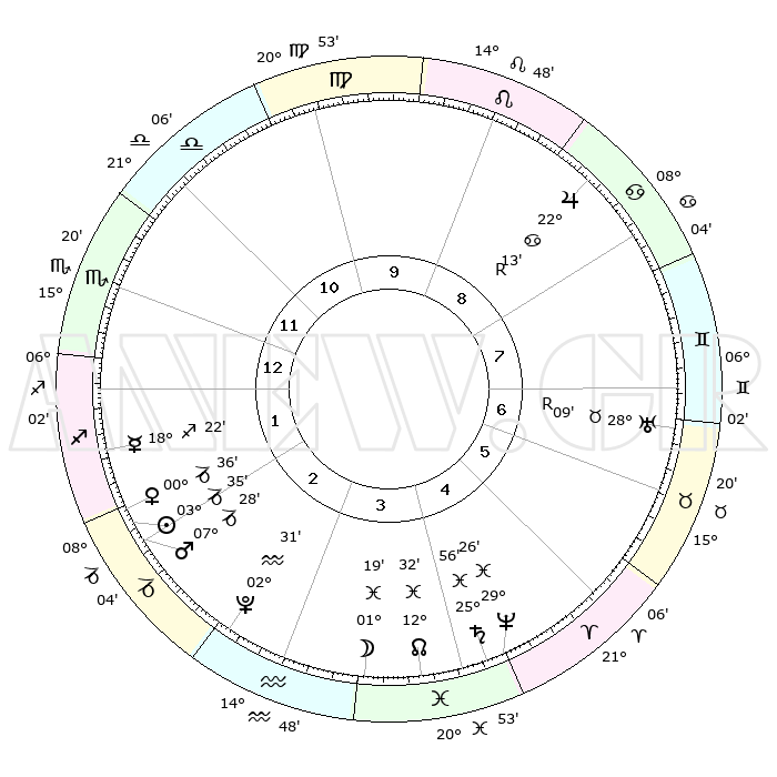 | | ΘΕΣΕΙΣ ΠΛΑΝΗΤΩΝ ΑΣΤΡΟΛΟΓΙΚΟΥ ΧΑΡΤΗ ΤΗΣ ΣΤΙΓΜΗΣ ΑΥΤΗΣ | | | | Πλανήτης | Ζώδιο | Μοίρες | Δεκαήμ. | Σε οίκο | Απόκλιση | | Ακμές των οίκων | | Ηλιος | Αιγόκερως | 03°31' | Πρώτο | 2 | 23 S 23 | | 1ος | 15°35' | Σκορπιός | | Σελήνη | Ιχθείς | 00°25' | Πρώτο | 4 | 12 S 13 | | 2ος | 15°07' | Τοξότης | | Ερμής | Τοξότης | 18°15' | Δεύτερο | 2 | 22 S 40 | | 3ος | 18°40' | Αιγόκερως | | Αφροδίτη | Αιγόκερως | 00°31' | Πρώτο | 2 | 23 S 40 | | 4ος | 23°59' | Υδροχόος | | Αρης | Αιγόκερως | 07°25' | Πρώτο | 2 | 24 S 04 | | 5ος | 26°22' | Ιχθείς | | Δίας | Καρκίνος | 22°14'R | Τρίτο | 9 | 21 N 49 | | 6ος | 23°20' | Κριός | | Κρόνος | Ιχθείς | 25°55' | Τρίτο | 4 | 03 S 43 | | 7ος | 15°35' | Ταύρος | | Ουρανός | Ταύρος | 28°09'R | Τρίτο | 7 | 19 N 33 | | 8ος | 15°07' | Δίδυμοι | | Ποσειδώνας | Ιχθείς | 29°26' | Τρίτο | 5 | 01 S 27 | | 9ος | 18°40' | Καρκίνος | | Πλούτωνας | Υδροχόος | 02°31' | Πρώτο | 3 | 23 S 16 | | 10ος | 23°59' | Λέων | | Β. Δεσμός | Ιχθείς | 12°32' | Δεύτερο | 4 | 06 S 51 | | 11ος | 26°22' | Παρθένος | | Ωροσκόπος | Σκορπιός | 15°35' | Δεύτερο | | | 12ος | 23°20' | Ζυγός | | Μεσουράνημα | Λέων | 23°59' | Τρίτο | | | |