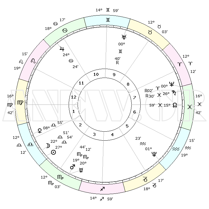 | ΘΕΣΕΙΣ ΠΛΑΝΗΤΩΝ ΑΣΤΡΟΛΟΓΙΚΟΥ ΧΑΡΤΗ ΤΗΣ ΣΤΙΓΜΗΣ ΑΥΤΗΣ | | Πλανήτης | Ζώδιο | Μοίρες | Δεκαήμ. | Σε οίκο | Απόκλιση | | Ακμές των οίκων | Ηλιος | Ζυγός | 27°49' | Τρίτο | 3 | 10 S 42 | | 1ος | 18°57' | Λέων | Σελήνη | Ζυγός | 21°42' | Τρίτο | 3 | 11 S 07 | | 2ος | 11°39' | Παρθένος | Ερμής | Σκορπιός | 20°04' | Τρίτο | 4 | 19 S 59 | | 3ος | 09°11' | Ζυγός | Αφροδίτη | Ζυγός | 08°48' | Πρώτο | 2 | 02 S 05 | | 4ος | 11°48' | Σκορπιός | Αρης | Σκορπιός | 19°40' | Δεύτερο | 4 | 17 S 55 | | 5ος | 16°48' | Τοξότης | Δίας | Καρκίνος | 24°23' | Τρίτο | 12 | 21 N 18 | | 6ος | 19°48' | Αιγόκερως | Κρόνος | Ιχθείς | 26°31'R | Τρίτο | 8 | 03 S 40 | | 7ος | 18°57' | Υδροχόος | Ουρανός | Δίδυμοι | 00°40'R | Πρώτο | 10 | 20 N 05 | | 8ος | 11°39' | Ιχθείς | Ποσειδώνας | Κριός | 00°02'R | Πρώτο | 8 | 01 S 15 | | 9ος | 09°11' | Κριός | Πλούτωνας | Υδροχόος | 01°23' | Πρώτο | 6 | 23 S 32 | | 10ος | 11°48' | Ταύρος | Β. Δεσμός | Ιχθείς | 15°59' | Δεύτερο | 8 | 05 S 32 | | 11ος | 16°48' | Δίδυμοι | Ωροσκόπος | Λέων | 18°57' | Δεύτερο | | | 12ος | 19°48' | Καρκίνος | Μεσουράνημα | Ταύρος | 11°48' | Δεύτερο | | | |