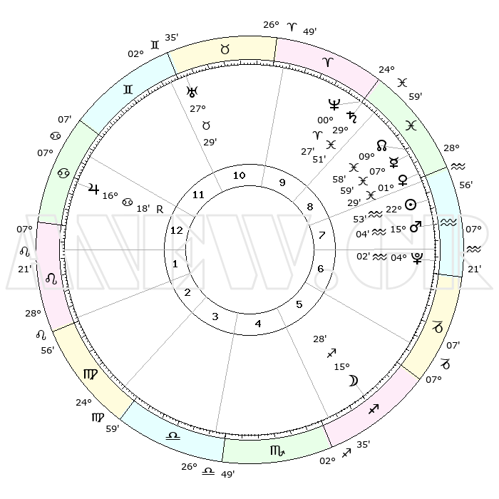 | | ΘΕΣΕΙΣ ΠΛΑΝΗΤΩΝ ΑΣΤΡΟΛΟΓΙΚΟΥ ΧΑΡΤΗ ΤΗΣ ΣΤΙΓΜΗΣ ΑΥΤΗΣ | | | | Πλανήτης | Ζώδιο | Μοίρες | Δεκαήμ. | Σε οίκο | Απόκλιση | | Ακμές των οίκων | | Ηλιος | Υδροχόος | 22°49' | Τρίτο | 8 | 13 S 54 | | 1ος | 16°52' | Καρκίνος | | Σελήνη | Τοξότης | 14°39' | Δεύτερο | 6 | 27 S 45 | | 2ος | 07°19' | Λέων | | Ερμής | Ιχθείς | 07°52' | Πρώτο | 9 | 09 S 13 | | 3ος | 00°41' | Παρθένος | | Αφροδίτη | Ιχθείς | 01°24' | Πρώτο | 9 | 12 S 20 | | 4ος | 29°48' | Παρθένος | | Αρης | Υδροχόος | 15°00' | Δεύτερο | 8 | 17 S 21 | | 5ος | 05°38' | Σκορπιός | | Δίας | Καρκίνος | 16°18'R | Δεύτερο | 12 | 22 N 45 | | 6ος | 13°33' | Τοξότης | | Κρόνος | Ιχθείς | 29°51' | Τρίτο | 10 | 02 S 02 | | 7ος | 16°52' | Αιγόκερως | | Ουρανός | Ταύρος | 27°29' | Τρίτο | 11 | 19 N 25 | | 8ος | 07°19' | Υδροχόος | | Ποσειδώνας | Κριός | 00°27' | Πρώτο | 10 | 01 S 01 | | 9ος | 00°41' | Ιχθείς | | Πλούτωνας | Υδροχόος | 04°02' | Πρώτο | 7 | 22 S 58 | | 10ος | 29°48' | Ιχθείς | | Β. Δεσμός | Ιχθείς | 09°58' | Πρώτο | 9 | 07 S 50 | | 11ος | 05°38' | Ταύρος | | Ωροσκόπος | Καρκίνος | 16°52' | Δεύτερο | | | 12ος | 13°33' | Δίδυμοι | | Μεσουράνημα | Ιχθείς | 29°48' | Τρίτο | | | |