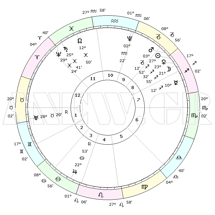 | | ΘΕΣΕΙΣ ΠΛΑΝΗΤΩΝ ΑΣΤΡΟΛΟΓΙΚΟΥ ΧΑΡΤΗ ΤΗΣ ΣΤΙΓΜΗΣ ΑΥΤΗΣ | | | | Πλανήτης | Ζώδιο | Μοίρες | Δεκαήμ. | Σε οίκο | Απόκλιση | | Ακμές των οίκων | | Ηλιος | Τοξότης | 27°47' | Τρίτο | 9 | 23 S 25 | | 1ος | 09°23' | Κριός | | Σελήνη | Τοξότης | 20°60' | Τρίτο | 9 | 28 S 03 | | 2ος | 17°17' | Ταύρος | | Ερμής | Τοξότης | 10°05' | Δεύτερο | 8 | 21 S 00 | | 3ος | 13°20' | Δίδυμοι | | Αφροδίτη | Τοξότης | 23°26' | Τρίτο | 9 | 23 S 17 | | 4ος | 05°17' | Καρκίνος | | Αρης | Αιγόκερως | 03°08' | Πρώτο | 9 | 24 S 12 | | 5ος | 28°04' | Καρκίνος | | Δίας | Καρκίνος | 22°53'R | Τρίτο | 4 | 21 N 42 | | 6ος | 26°59' | Λέων | | Κρόνος | Ιχθείς | 25°41' | Τρίτο | 12 | 03 S 50 | | 7ος | 09°23' | Ζυγός | | Ουρανός | Ταύρος | 28°20'R | Τρίτο | 2 | 19 N 35 | | 8ος | 17°17' | Σκορπιός | | Ποσειδώνας | Ιχθείς | 29°24' | Τρίτο | 12 | 01 S 28 | | 9ος | 13°19' | Τοξότης | | Πλούτωνας | Υδροχόος | 02°22' | Πρώτο | 11 | 23 S 18 | | 10ος | 05°17' | Αιγόκερως | | Β. Δεσμός | Ιχθείς | 12°50' | Δεύτερο | 12 | 06 S 44 | | 11ος | 28°04' | Αιγόκερως | | Ωροσκόπος | Κριός | 09°23' | Πρώτο | | | 12ος | 26°59' | Υδροχόος | | Μεσουράνημα | Αιγόκερως | 05°17' | Πρώτο | | | |