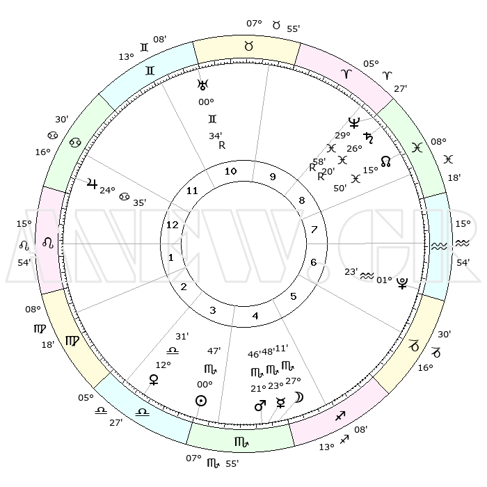 | ΘΕΣΕΙΣ ΠΛΑΝΗΤΩΝ ΑΣΤΡΟΛΟΓΙΚΟΥ ΧΑΡΤΗ ΤΗΣ ΣΤΙΓΜΗΣ ΑΥΤΗΣ | | Πλανήτης | Ζώδιο | Μοίρες | Δεκαήμ. | Σε οίκο | Απόκλιση | | Ακμές των οίκων | Ηλιος | Σκορπιός | 00°37' | Πρώτο | 5 | 11 S 41 | | 1ος | 28°45' | Δίδυμοι | Σελήνη | Σκορπιός | 25°20' | Τρίτο | 6 | 23 S 42 | | 2ος | 19°37' | Καρκίνος | Ερμής | Σκορπιός | 23°37' | Τρίτο | 6 | 21 S 08 | | 3ος | 11°20' | Λέων | Αφροδίτη | Ζυγός | 12°19' | Δεύτερο | 5 | 03 S 27 | | 4ος | 07°27' | Παρθένος | Αρης | Σκορπιός | 21°39' | Τρίτο | 6 | 18 S 29 | | 5ος | 11°12' | Ζυγός | Δίας | Καρκίνος | 24°34' | Τρίτο | 2 | 21 N 16 | | 6ος | 21°17' | Σκορπιός | Κρόνος | Ιχθείς | 26°21'R | Τρίτο | 10 | 03 S 44 | | 7ος | 28°45' | Τοξότης | Ουρανός | Δίδυμοι | 00°34'R | Πρώτο | 12 | 20 N 04 | | 8ος | 19°37' | Αιγόκερως | Ποσειδώνας | Ιχθείς | 29°58'R | Τρίτο | 10 | 01 S 16 | | 9ος | 11°20' | Υδροχόος | Πλούτωνας | Υδροχόος | 01°23' | Πρώτο | 8 | 23 S 32 | | 10ος | 07°27' | Ιχθείς | Β. Δεσμός | Ιχθείς | 15°50' | Δεύτερο | 10 | 05 S 35 | | 11ος | 11°12' | Κριός | Ωροσκόπος | Δίδυμοι | 28°45' | Τρίτο | | | 12ος | 21°17' | Ταύρος | Μεσουράνημα | Ιχθείς | 07°27' | Πρώτο | | | |