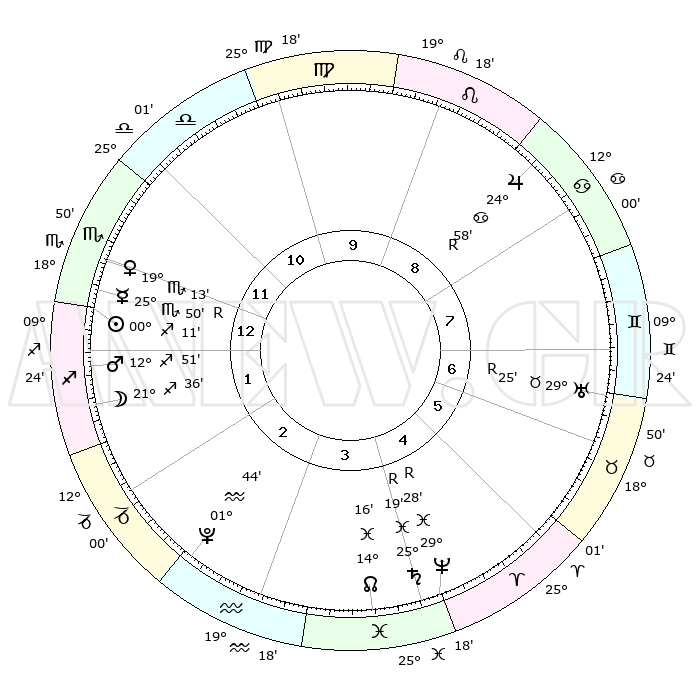 | | ΘΕΣΕΙΣ ΠΛΑΝΗΤΩΝ ΑΣΤΡΟΛΟΓΙΚΟΥ ΧΑΡΤΗ ΤΗΣ ΣΤΙΓΜΗΣ ΑΥΤΗΣ | | | | Πλανήτης | Ζώδιο | Μοίρες | Δεκαήμ. | Σε οίκο | Απόκλιση | | Ακμές των οίκων | | Ηλιος | Τοξότης | 00°09' | Πρώτο | 1 | 20 S 11 | | 1ος | 26°31' | Σκορπιός | | Σελήνη | Τοξότης | 21°04' | Τρίτο | 1 | 28 S 06 | | 2ος | 27°11' | Τοξότης | | Ερμής | Σκορπιός | 25°53'R | Τρίτο | 12 | 18 S 07 | | 3ος | 02°19' | Υδροχόος | | Αφροδίτη | Σκορπιός | 19°10' | Δεύτερο | 12 | 16 S 33 | | 4ος | 08°15' | Ιχθείς | | Αρης | Τοξότης | 12°49' | Δεύτερο | 1 | 22 S 55 | | 5ος | 09°42' | Κριός | | Δίας | Καρκίνος | 24°58'R | Τρίτο | 8 | 21 N 16 | | 6ος | 05°13' | Ταύρος | | Κρόνος | Ιχθείς | 25°19'R | Τρίτο | 4 | 04 S 04 | | 7ος | 26°31' | Ταύρος | | Ουρανός | Ταύρος | 29°25'R | Τρίτο | 7 | 19 N 49 | | 8ος | 27°11' | Δίδυμοι | | Ποσειδώνας | Ιχθείς | 29°28'R | Τρίτο | 4 | 01 S 28 | | 9ος | 02°19' | Λέων | | Πλούτωνας | Υδροχόος | 01°44' | Πρώτο | 2 | 23 S 26 | | 10ος | 08°15' | Παρθένος | | Β. Δεσμός | Ιχθείς | 14°17' | Δεύτερο | 4 | 06 S 11 | | 11ος | 09°42' | Ζυγός | | Ωροσκόπος | Σκορπιός | 26°31' | Τρίτο | | | 12ος | 05°13' | Σκορπιός | | Μεσουράνημα | Παρθένος | 08°15' | Πρώτο | | | |