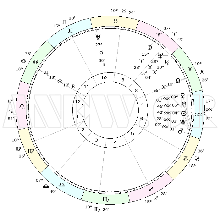 | | ΘΕΣΕΙΣ ΠΛΑΝΗΤΩΝ ΑΣΤΡΟΛΟΓΙΚΟΥ ΧΑΡΤΗ ΤΗΣ ΣΤΙΓΜΗΣ ΑΥΤΗΣ | | | | Πλανήτης | Ζώδιο | Μοίρες | Δεκαήμ. | Σε οίκο | Απόκλιση | | Ακμές των οίκων | | Ηλιος | Υδροχόος | 04°38' | Πρώτο | 7 | 19 S 06 | | 1ος | 26°39' | Καρκίνος | | Σελήνη | Κριός | 14°23' | Δεύτερο | 10 | 08 N 26 | | 2ος | 17°29' | Λέων | | Ερμής | Υδροχόος | 06°39' | Πρώτο | 7 | 20 S 38 | | 3ος | 12°05' | Παρθένος | | Αφροδίτη | Υδροχόος | 08°56' | Πρώτο | 7 | 19 S 12 | | 4ος | 12°40' | Ζυγός | | Αρης | Υδροχόος | 00°58' | Πρώτο | 7 | 20 S 56 | | 5ος | 18°46' | Σκορπιός | | Δίας | Καρκίνος | 18°14'R | Δεύτερο | 12 | 22 N 29 | | 6ος | 25°02' | Τοξότης | | Κρόνος | Ιχθείς | 28°04' | Τρίτο | 9 | 02 S 47 | | 7ος | 26°39' | Αιγόκερως | | Ουρανός | Ταύρος | 27°30'R | Τρίτο | 11 | 19 N 25 | | 8ος | 17°29' | Υδροχόος | | Ποσειδώνας | Ιχθείς | 29°57' | Τρίτο | 9 | 01 S 14 | | 9ος | 12°05' | Ιχθείς | | Πλούτωνας | Υδροχόος | 03°28' | Πρώτο | 7 | 23 S 04 | | 10ος | 12°40' | Κριός | | Β. Δεσμός | Ιχθείς | 10°55' | Δεύτερο | 8 | 07 S 28 | | 11ος | 18°46' | Ταύρος | | Ωροσκόπος | Καρκίνος | 26°39' | Τρίτο | | | 12ος | 25°02' | Δίδυμοι | | Μεσουράνημα | Κριός | 12°40' | Δεύτερο | | | |