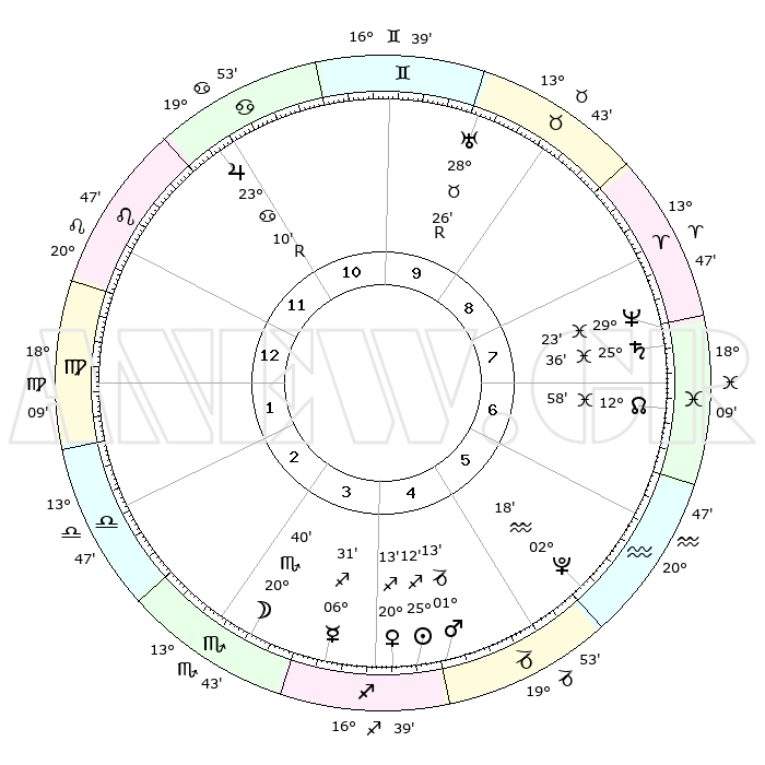 | | ΘΕΣΕΙΣ ΠΛΑΝΗΤΩΝ ΑΣΤΡΟΛΟΓΙΚΟΥ ΧΑΡΤΗ ΤΗΣ ΣΤΙΓΜΗΣ ΑΥΤΗΣ | | | | Πλανήτης | Ζώδιο | Μοίρες | Δεκαήμ. | Σε οίκο | Απόκλιση | | Ακμές των οίκων | | Ηλιος | Τοξότης | 24°52' | Τρίτο | 7 | 23 S 20 | | 1ος | 06°18' | Δίδυμοι | | Σελήνη | Σκορπιός | 16°47' | Δεύτερο | 6 | 21 S 09 | | 2ος | 29°55' | Δίδυμοι | | Ερμής | Τοξότης | 06°04' | Πρώτο | 6 | 20 S 00 | | 3ος | 21°10' | Καρκίνος | | Αφροδίτη | Τοξότης | 19°48' | Δεύτερο | 7 | 22 S 56 | | 4ος | 14°27' | Λέων | | Αρης | Αιγόκερως | 00°58' | Πρώτο | 8 | 24 S 13 | | 5ος | 14°03' | Παρθένος | | Δίας | Καρκίνος | 23°12'R | Τρίτο | 3 | 21 N 38 | | 6ος | 23°22' | Ζυγός | | Κρόνος | Ιχθείς | 25°35' | Τρίτο | 11 | 03 S 53 | | 7ος | 06°18' | Τοξότης | | Ουρανός | Ταύρος | 28°26'R | Τρίτο | 12 | 19 N 37 | | 8ος | 29°55' | Τοξότης | | Ποσειδώνας | Ιχθείς | 29°23' | Τρίτο | 11 | 01 S 29 | | 9ος | 21°10' | Αιγόκερως | | Πλούτωνας | Υδροχόος | 02°17' | Πρώτο | 9 | 23 S 19 | | 10ος | 14°27' | Υδροχόος | | Β. Δεσμός | Ιχθείς | 12°59' | Δεύτερο | 10 | 06 S 41 | | 11ος | 14°03' | Ιχθείς | | Ωροσκόπος | Δίδυμοι | 06°18' | Πρώτο | | | 12ος | 23°22' | Κριός | | Μεσουράνημα | Υδροχόος | 14°27' | Δεύτερο | | | |