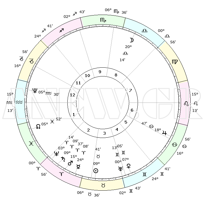 | | ΘΕΣΕΙΣ ΠΛΑΝΗΤΩΝ ΑΣΤΡΟΛΟΓΙΚΟΥ ΧΑΡΤΗ ΤΗΣ ΣΤΙΓΜΗΣ ΑΥΤΗΣ | | | | Πλανήτης | Ζώδιο | Μοίρες | Δεκαήμ. | Σε οίκο | Απόκλιση | | Ακμές των οίκων | | Ηλιος | Ταύρος | 09°35' | Πρώτο | 4 | 14 N 41 | | 1ος | 05°56' | Αιγόκερως | | Σελήνη | Ζυγός | 19°02' | Δεύτερο | 9 | 10 S 35 | | 2ος | 14°36' | Υδροχόος | | Ερμής | Κριός | 23°57' | Τρίτο | 3 | 07 N 24 | | 3ος | 24°52' | Ιχθείς | | Αφροδίτη | Δίδυμοι | 06°58' | Πρώτο | 5 | 22 N 18 | | 4ος | 27°48' | Κριός | | Αρης | Κριός | 15°32' | Δεύτερο | 3 | 05 N 17 | | 5ος | 23°13' | Ταύρος | | Δίας | Καρκίνος | 18°46' | Δεύτερο | 7 | 22 N 30 | | 6ος | 14°41' | Δίδυμοι | | Κρόνος | Κριός | 09°08' | Πρώτο | 3 | 01 N 38 | | 7ος | 05°56' | Καρκίνος | | Ουρανός | Δίδυμοι | 00°13' | Πρώτο | 5 | 20 N 02 | | 8ος | 14°36' | Λέων | | Ποσειδώνας | Κριός | 03°14' | Πρώτο | 3 | 00 N 04 | | 9ος | 24°52' | Παρθένος | | Πλούτωνας | Υδροχόος | 05°30' | Πρώτο | 1 | 22 S 49 | | 10ος | 27°48' | Ζυγός | | Β. Δεσμός | Ιχθείς | 05°52' | Πρώτο | 2 | 09 S 21 | | 11ος | 23°13' | Σκορπιός | | Ωροσκόπος | Αιγόκερως | 05°56' | Πρώτο | | | 12ος | 14°41' | Τοξότης | | Μεσουράνημα | Ζυγός | 27°48' | Τρίτο | | | |