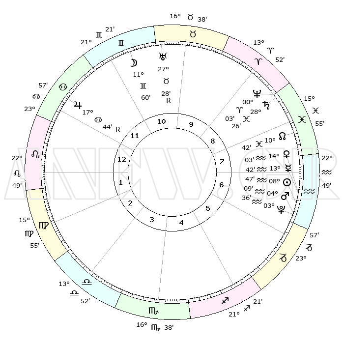 | | ΘΕΣΕΙΣ ΠΛΑΝΗΤΩΝ ΑΣΤΡΟΛΟΓΙΚΟΥ ΧΑΡΤΗ ΤΗΣ ΣΤΙΓΜΗΣ ΑΥΤΗΣ | | | | Πλανήτης | Ζώδιο | Μοίρες | Δεκαήμ. | Σε οίκο | Απόκλιση | | Ακμές των οίκων | | Ηλιος | Υδροχόος | 08°43' | Πρώτο | 7 | 18 S 05 | | 1ος | 03°54' | Λέων | | Σελήνη | Δίδυμοι | 11°03' | Δεύτερο | 11 | 27 N 15 | | 2ος | 25°13' | Λέων | | Ερμής | Υδροχόος | 13°35' | Δεύτερο | 7 | 18 S 41 | | 3ος | 20°48' | Παρθένος | | Αφροδίτη | Υδροχόος | 13°58' | Δεύτερο | 7 | 17 S 53 | | 4ος | 22°17' | Ζυγός | | Αρης | Υδροχόος | 04°06' | Πρώτο | 7 | 20 S 14 | | 5ος | 28°13' | Σκορπιός | | Δίας | Καρκίνος | 17°45'R | Δεύτερο | 12 | 22 N 33 | | 6ος | 03°17' | Αιγόκερως | | Κρόνος | Ιχθείς | 28°26' | Τρίτο | 9 | 02 S 38 | | 7ος | 03°54' | Υδροχόος | | Ουρανός | Ταύρος | 27°29'R | Τρίτο | 10 | 19 N 24 | | 8ος | 25°13' | Υδροχόος | | Ποσειδώνας | Κριός | 00°03' | Πρώτο | 9 | 01 S 11 | | 9ος | 20°48' | Ιχθείς | | Πλούτωνας | Υδροχόος | 03°36' | Πρώτο | 6 | 23 S 03 | | 10ος | 22°17' | Κριός | | Β. Δεσμός | Ιχθείς | 10°42' | Δεύτερο | 8 | 07 S 33 | | 11ος | 28°13' | Ταύρος | | Ωροσκόπος | Λέων | 03°54' | Πρώτο | | | 12ος | 03°17' | Καρκίνος | | Μεσουράνημα | Κριός | 22°17' | Τρίτο | | | |