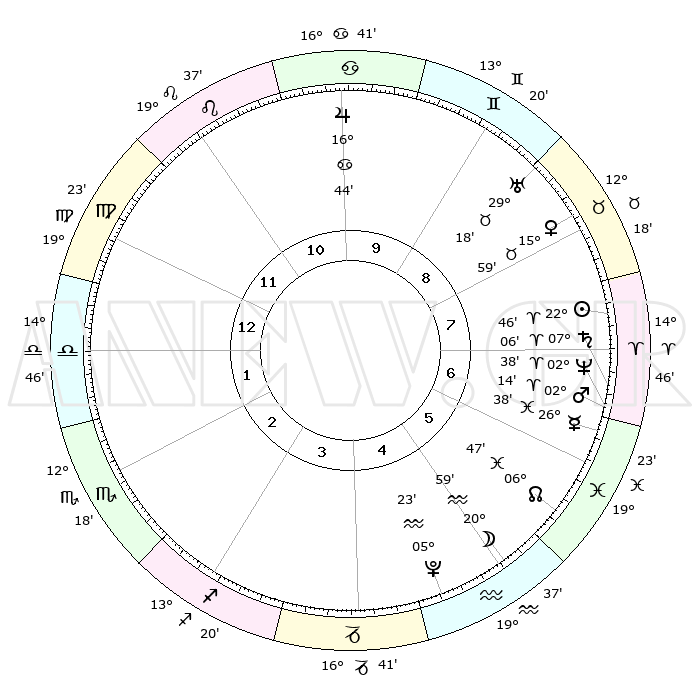 | | ΘΕΣΕΙΣ ΠΛΑΝΗΤΩΝ ΑΣΤΡΟΛΟΓΙΚΟΥ ΧΑΡΤΗ ΤΗΣ ΣΤΙΓΜΗΣ ΑΥΤΗΣ | | | | Πλανήτης | Ζώδιο | Μοίρες | Δεκαήμ. | Σε οίκο | Απόκλιση | | Ακμές των οίκων | | Ηλιος | Κριός | 22°42' | Τρίτο | 8 | 08 N 50 | | 1ος | 22°03' | Παρθένος | | Σελήνη | Υδροχόος | 20°00' | Τρίτο | 5 | 16 S 20 | | 2ος | 18°01' | Ζυγός | | Ερμής | Ιχθείς | 26°32' | Τρίτο | 7 | 03 S 40 | | 3ος | 18°07' | Σκορπιός | | Αφροδίτη | Ταύρος | 15°54' | Δεύτερο | 8 | 16 N 39 | | 4ος | 21°03' | Τοξότης | | Αρης | Κριός | 02°11' | Πρώτο | 7 | 00 S 03 | | 5ος | 24°11' | Αιγόκερως | | Δίας | Καρκίνος | 16°43' | Δεύτερο | 10 | 22 N 46 | | 6ος | 24°55' | Υδροχόος | | Κρόνος | Κριός | 07°06' | Πρώτο | 7 | 00 N 51 | | 7ος | 22°03' | Ιχθείς | | Ουρανός | Ταύρος | 29°18' | Τρίτο | 9 | 19 N 50 | | 8ος | 18°01' | Κριός | | Ποσειδώνας | Κριός | 02°38' | Πρώτο | 7 | 00 S 09 | | 9ος | 18°07' | Ταύρος | | Πλούτωνας | Υδροχόος | 05°23' | Πρώτο | 5 | 22 S 47 | | 10ος | 21°03' | Δίδυμοι | | Β. Δεσμός | Ιχθείς | 06°47' | Πρώτο | 6 | 09 S 01 | | 11ος | 24°11' | Καρκίνος | | Ωροσκόπος | Παρθένος | 22°03' | Τρίτο | | | 12ος | 24°55' | Λέων | | Μεσουράνημα | Δίδυμοι | 21°03' | Τρίτο | | | |