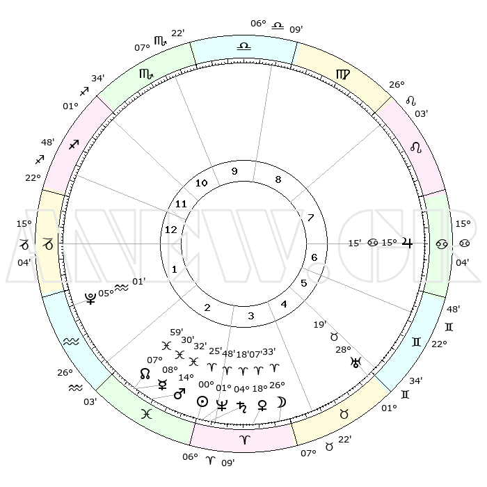 | | ΘΕΣΕΙΣ ΠΛΑΝΗΤΩΝ ΑΣΤΡΟΛΟΓΙΚΟΥ ΧΑΡΤΗ ΤΗΣ ΣΤΙΓΜΗΣ ΑΥΤΗΣ | | | | Πλανήτης | Ζώδιο | Μοίρες | Δεκαήμ. | Σε οίκο | Απόκλιση | | Ακμές των οίκων | | Ηλιος | Κριός | 00°21' | Πρώτο | 3 | 00 N 08 | | 1ος | 19°32' | Τοξότης | | Σελήνη | Κριός | 25°28' | Τρίτο | 4 | 13 N 24 | | 2ος | 24°11' | Αιγόκερως | | Ερμής | Ιχθείς | 08°30' | Πρώτο | 3 | 07 S 30 | | 3ος | 03°03' | Ιχθείς | | Αφροδίτη | Κριός | 18°01' | Δεύτερο | 4 | 06 N 16 | | 4ος | 08°23' | Κριός | | Αρης | Ιχθείς | 14°28' | Δεύτερο | 3 | 07 S 06 | | 5ος | 06°26' | Ταύρος | | Δίας | Καρκίνος | 15°15' | Δεύτερο | 7 | 22 N 55 | | 6ος | 29°06' | Ταύρος | | Κρόνος | Κριός | 04°17' | Πρώτο | 3 | 00 S 15 | | 7ος | 19°32' | Δίδυμοι | | Ουρανός | Ταύρος | 28°19' | Τρίτο | 5 | 19 N 37 | | 8ος | 24°11' | Καρκίνος | | Ποσειδώνας | Κριός | 01°48' | Πρώτο | 3 | 00 S 29 | | 9ος | 03°03' | Παρθένος | | Πλούτωνας | Υδροχόος | 05°01' | Πρώτο | 2 | 22 S 48 | | 10ος | 08°23' | Ζυγός | | Β. Δεσμός | Ιχθείς | 07°59' | Πρώτο | 3 | 08 S 34 | | 11ος | 06°26' | Σκορπιός | | Ωροσκόπος | Τοξότης | 19°32' | Δεύτερο | | | 12ος | 29°06' | Σκορπιός | | Μεσουράνημα | Ζυγός | 08°23' | Πρώτο | | | |