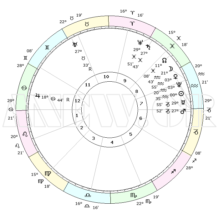 | | ΘΕΣΕΙΣ ΠΛΑΝΗΤΩΝ ΑΣΤΡΟΛΟΓΙΚΟΥ ΧΑΡΤΗ ΤΗΣ ΣΤΙΓΜΗΣ ΑΥΤΗΣ | | | | Πλανήτης | Ζώδιο | Μοίρες | Δεκαήμ. | Σε οίκο | Απόκλιση | | Ακμές των οίκων | | Ηλιος | Υδροχόος | 00°28' | Πρώτο | 8 | 20 S 03 | | 1ος | 24°44' | Δίδυμοι | | Σελήνη | Υδροχόος | 20°18' | Τρίτο | 9 | 16 S 19 | | 2ος | 15°54' | Καρκίνος | | Ερμής | Αιγόκερως | 29°44' | Τρίτο | 8 | 22 S 11 | | 3ος | 07°25' | Λέων | | Αφροδίτη | Υδροχόος | 03°47' | Πρώτο | 8 | 20 S 24 | | 4ος | 02°56' | Παρθένος | | Αρης | Αιγόκερως | 27°47' | Τρίτο | 8 | 21 S 35 | | 5ος | 05°58' | Ζυγός | | Δίας | Καρκίνος | 18°45'R | Δεύτερο | 2 | 22 N 24 | | 6ος | 16°14' | Σκορπιός | | Κρόνος | Ιχθείς | 27°42' | Τρίτο | 10 | 02 S 56 | | 7ος | 24°44' | Τοξότης | | Ουρανός | Ταύρος | 27°33'R | Τρίτο | 12 | 19 N 25 | | 8ος | 15°54' | Αιγόκερως | | Ποσειδώνας | Ιχθείς | 29°51' | Τρίτο | 10 | 01 S 16 | | 9ος | 07°25' | Υδροχόος | | Πλούτωνας | Υδροχόος | 03°20' | Πρώτο | 8 | 23 S 06 | | 10ος | 02°56' | Ιχθείς | | Β. Δεσμός | Ιχθείς | 11°08' | Δεύτερο | 10 | 07 S 23 | | 11ος | 05°58' | Κριός | | Ωροσκόπος | Δίδυμοι | 24°44' | Τρίτο | | | 12ος | 16°14' | Ταύρος | | Μεσουράνημα | Ιχθείς | 02°56' | Πρώτο | | | |